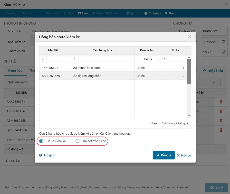 - Tích chọn Chưa kiểm kê trong trường hợp chưa thực hiện kiểm kê những hàng hóa đó, chương trình sẽ ghi nhận mặt hàng này chưa được kiểm kê và số lượng hàng hóa không thay đổi.