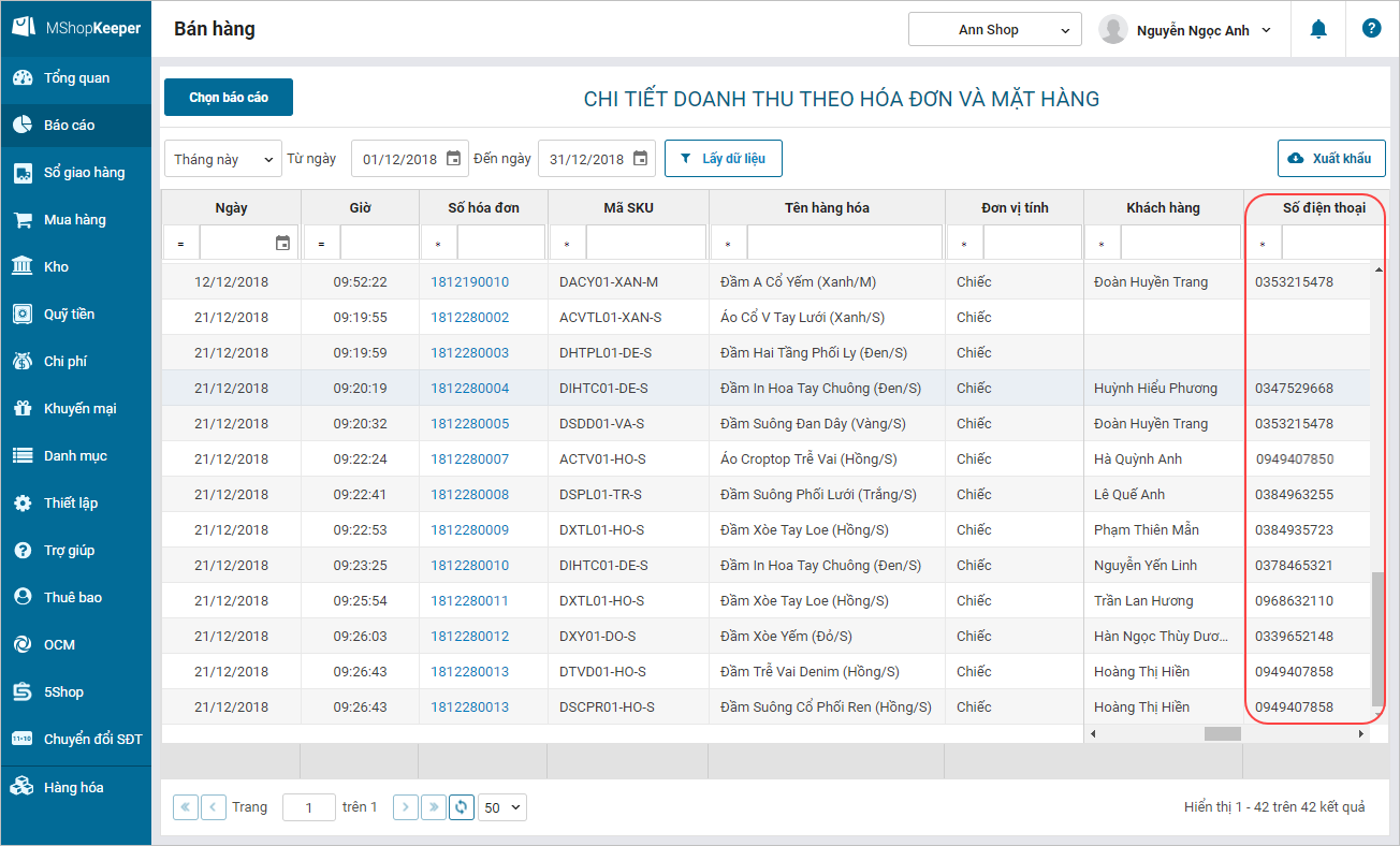 - Trên Báo cáo Chi tiết doanh thu theo hóa đơn và từng mặt hàng: