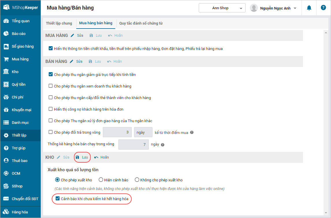 - Tích chọn ô Cảnh báo khi chưa kiểm kê hết hàng hóa.