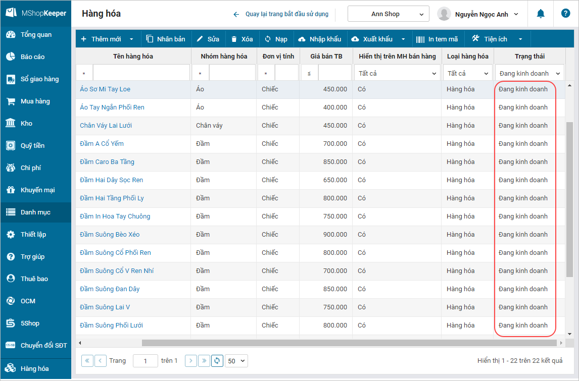 Chi tiết thay đổi: Hiện tại, khi quản lý mở danh mục Hàng hóa, chương trình sẽ hiển thị tất cả hàng hóa bao gồm trạng thái đang kinh doanh và ngừng kinh doanh. Để theo dõi các mặt hàng đang kinh doanh, quản lý cần thực hiện lọc dữ liệu. Để xem các danh mục Nhà cung cấp, Đối tác giao hàng, Khách hàng, Nhân viên,… các thao tác cũng thực hiện tương tự. Điều này sẽ gây tốn thời gian và gây khó khăn cho quản lý khi xem các danh mục trên.