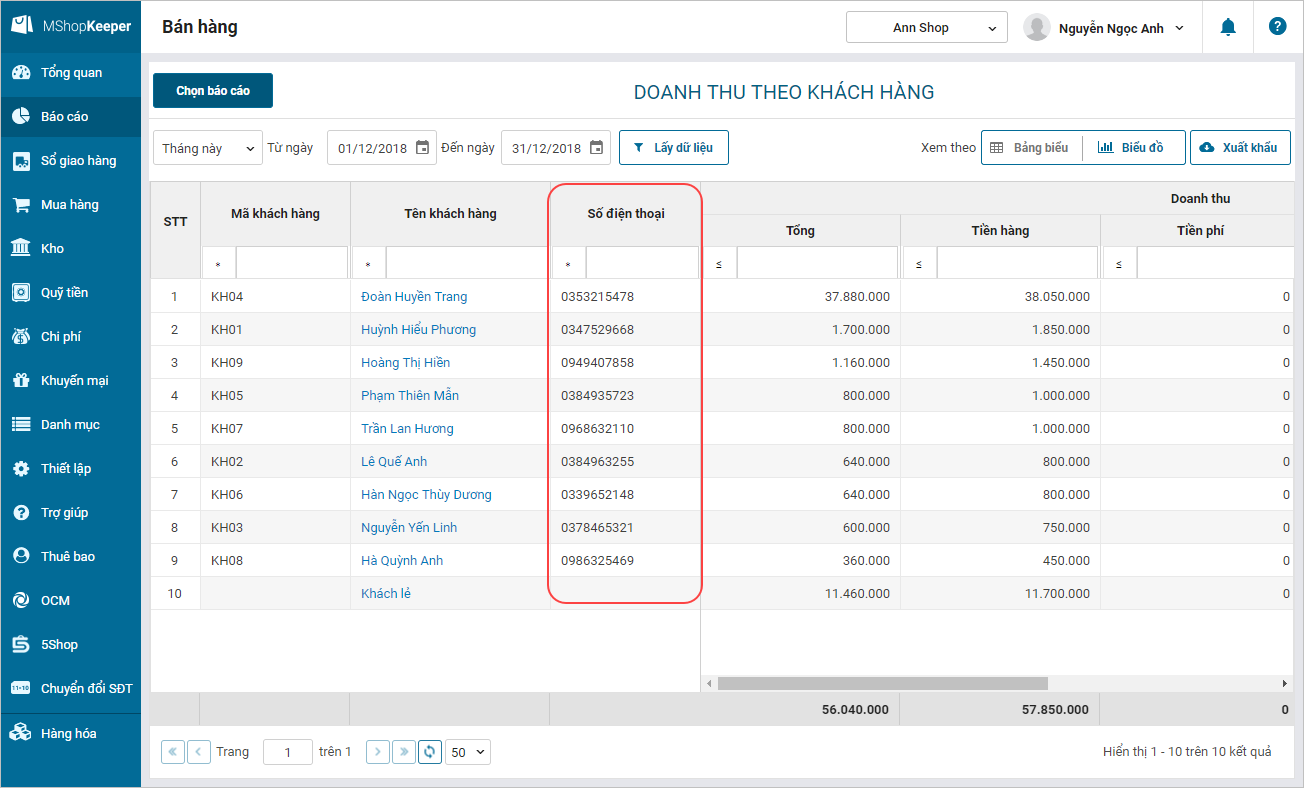 - Trên Báo cáo Doanh thu theo khách hàng: