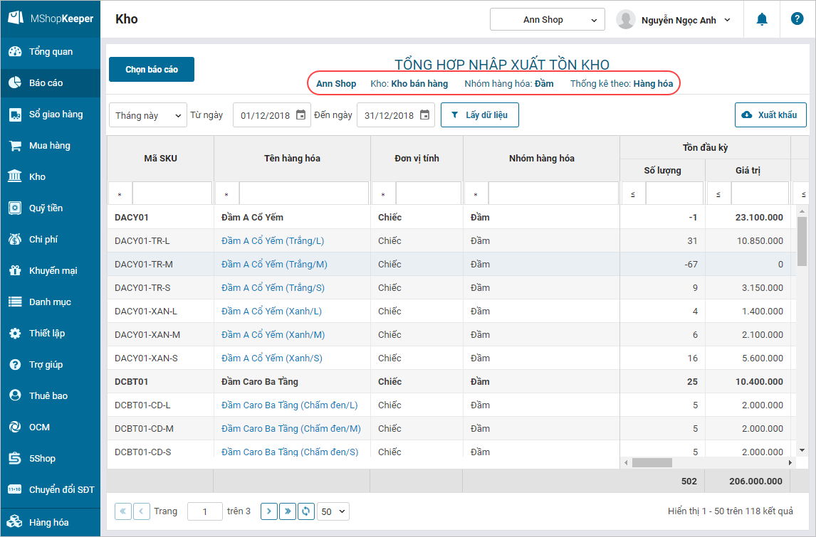 - Trên báo cáo Tổng hợp nhập xuất tồn kho sẽ hiển thị các tiêu chí đã lọc.
