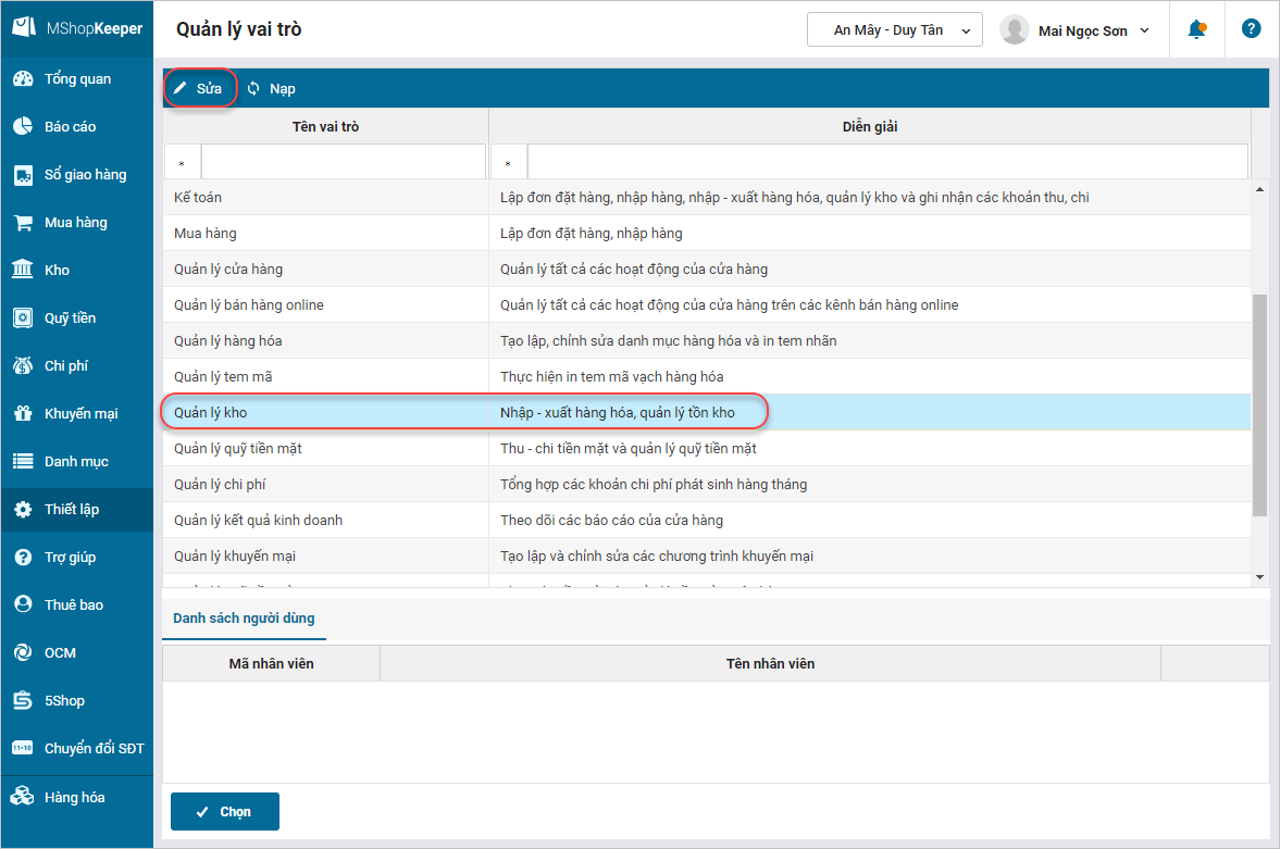 - Chọn vai trò Quản lý kho, sau đó nhấn Sửa. Hoặc kích đúp vào vai trò.