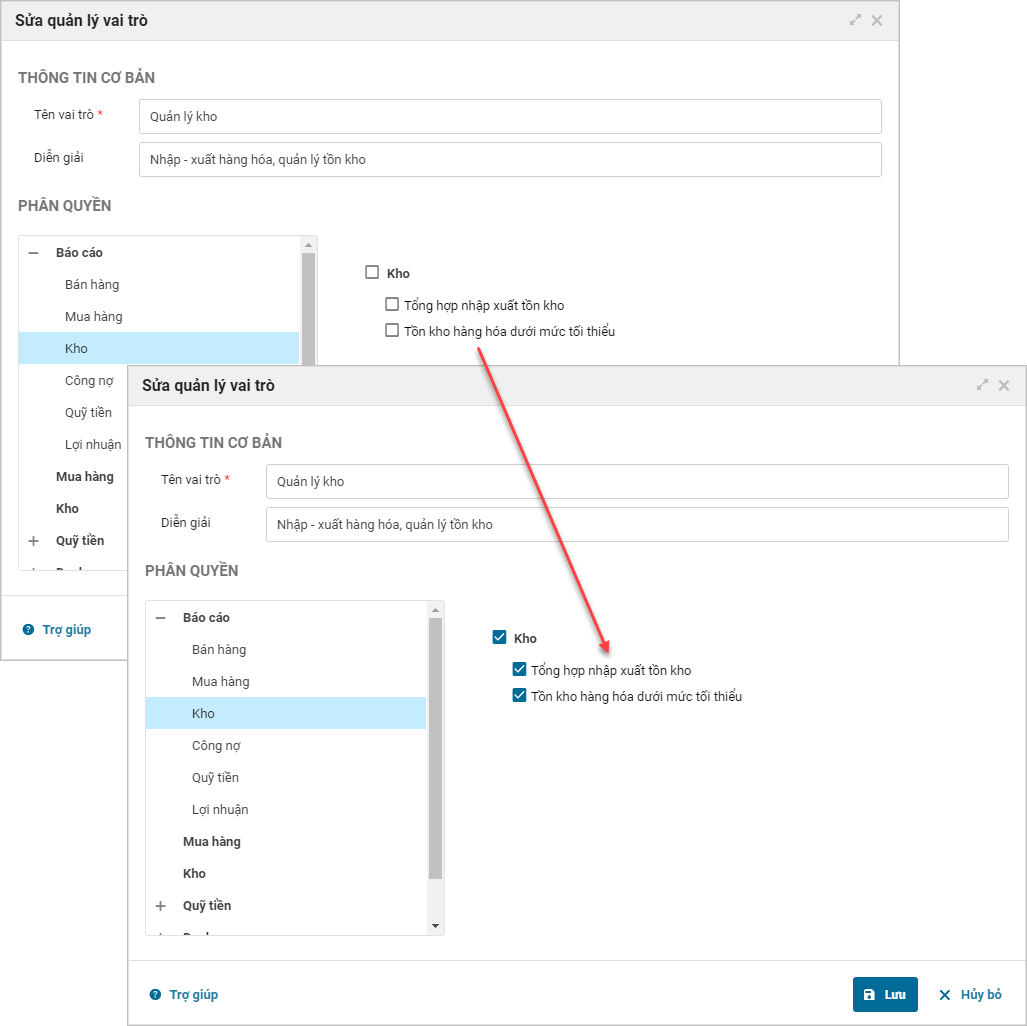 - Chương trình hiện màn hình Sửa quản lý vai trò. Tại mục phân quyền chọn Báo cáo\Kho.