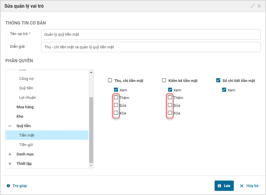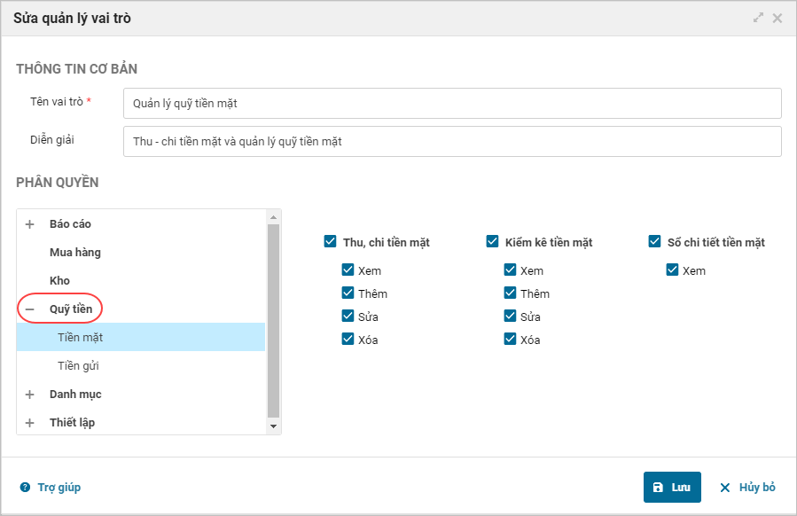 - Chương trình hiện màn hình Sửa quản lý vai trò. Tại mục phân quyền chọn Quỹ tiền.