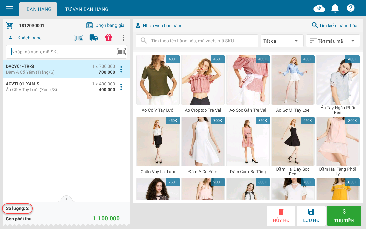 2. [Android] Khi tính tiền, Thu ngân muốn biết tổng số lượng hàng hóa đã chọn cho khách hàng là bao nhiêu để so sánh với số lượng hàng thực tế bên ngoài xem đã xuất đúng số lượng hàng thực tế như ghi nhận trên phần mềm chưa.
