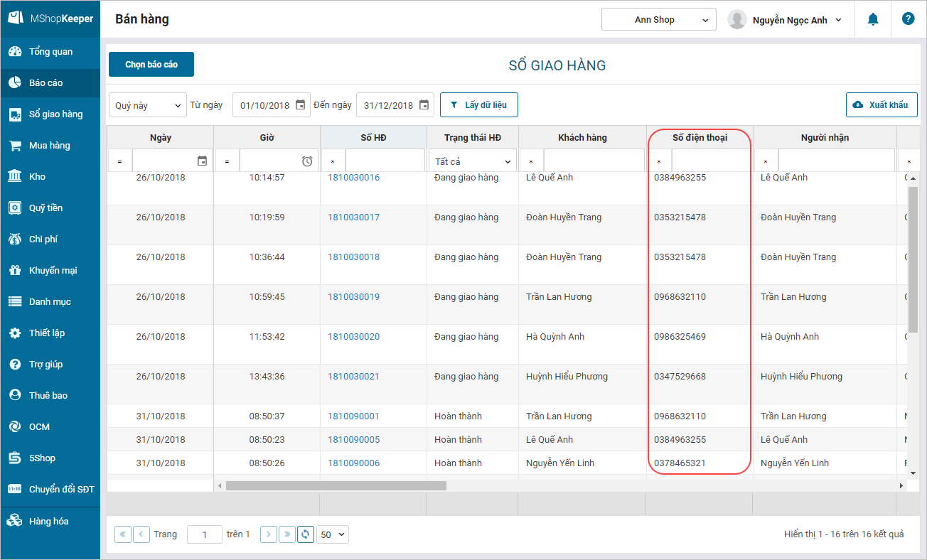 - Trên Báo cáo Sổ giao hàng:
