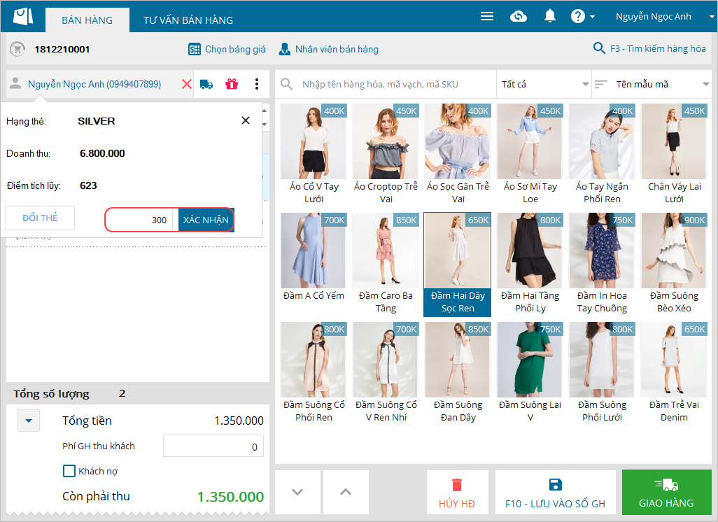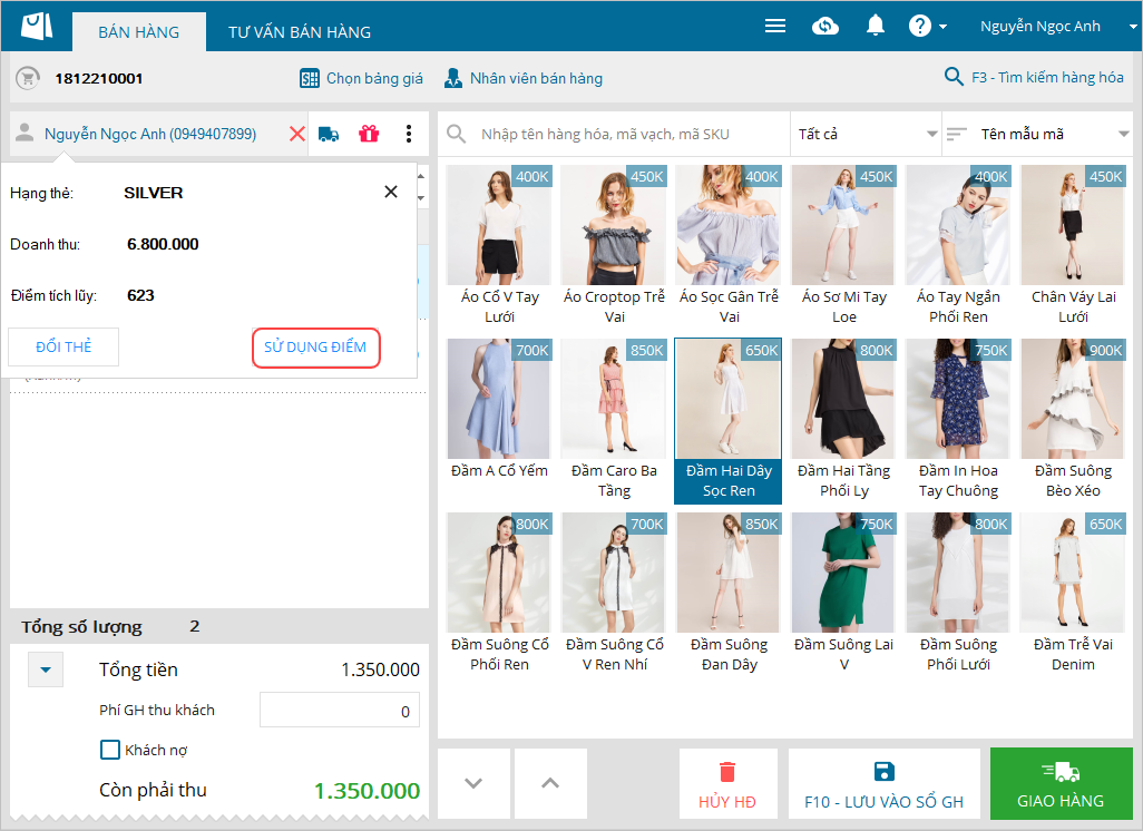 2. Với hóa đơn giao hàng, Thu ngân muốn sử dụng điểm thẻ thành viên đã tích để thanh toán hóa đơn.