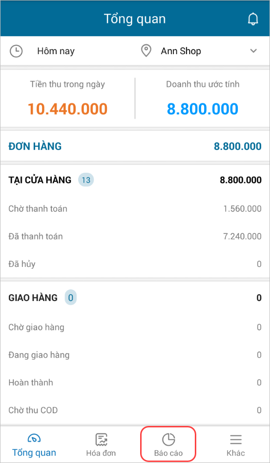 - Trên ứng dụng MShopKeeper Quản lý, chọn tab Báo cáo.