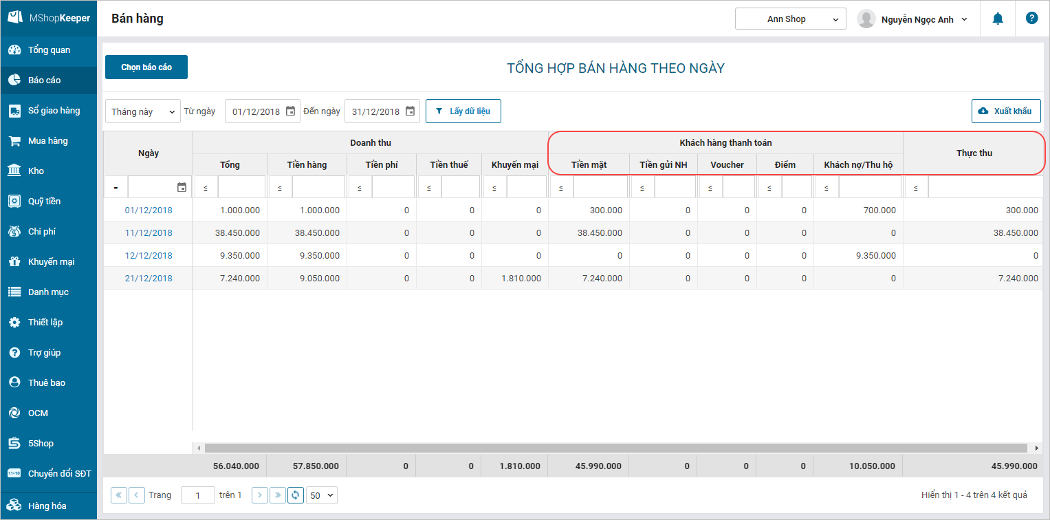 Chi tiết thay đổi: Hiện tại, trên báo cáo Tổng hợp bán hàng theo ngày, số tiền Thực thu đang bao gồm tiền Khách nợ/Thu COD. Điều này khiến quản lý gặp khó khăn trong việc theo dõi tổng tiền khách thanh toán. Nhằm giúp quản lý dễ dàng nắm bắt được các số liệu trong báo cáo, kể từ phiên bản R17, chương trình thay đổi cách tính số liệu trên báo cáo, số tiền Thực thu = tổng Tiền mặt + Tiền gửi ngân hàng + Voucher + Điểm.