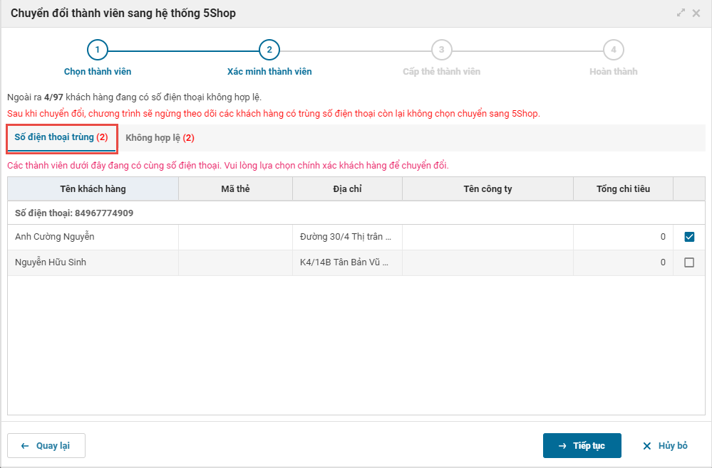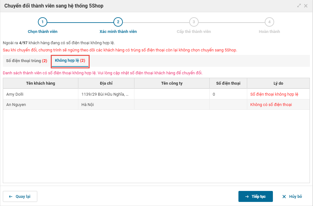 - Trang web quản lý 5Shop, khi quản lý thực hiện chuyển đổi thành viên chương trình sẽ xác minh thành viên bao gồm các trường hợp khách hàng bị trùng số điện thoại và số điện thoại không hợp lệ.