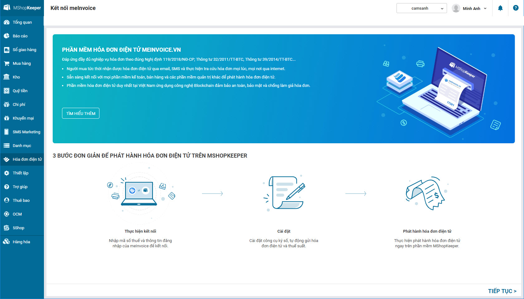 - Lần đầu tiên truy cập phân hệ Hóa đơn điện tử, chương trình sẽ hiển thị trang giới thiệu. Trang giới thiệu sẽ không hiển thị lại sau khi ấn Tiếp tục.