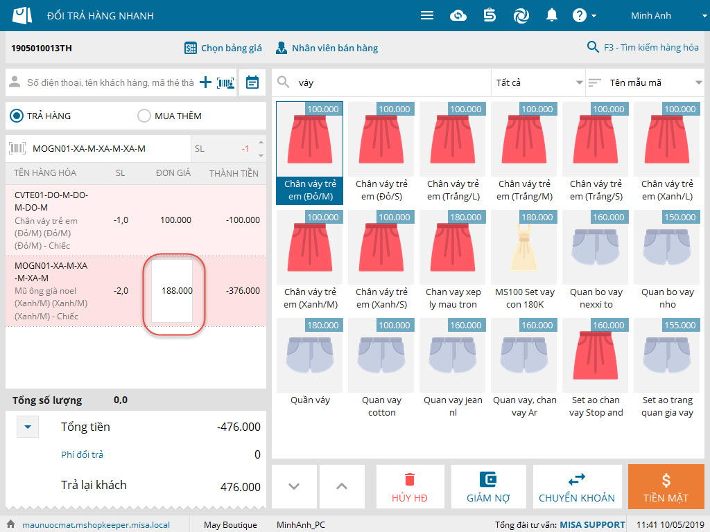 - Ở màn Đổi trả nhanh, nhân viên có quyền điều chỉnh giá bán khi thực hiện đổi trả nhanh sẽ sửa được đơn giá của hàng hóa