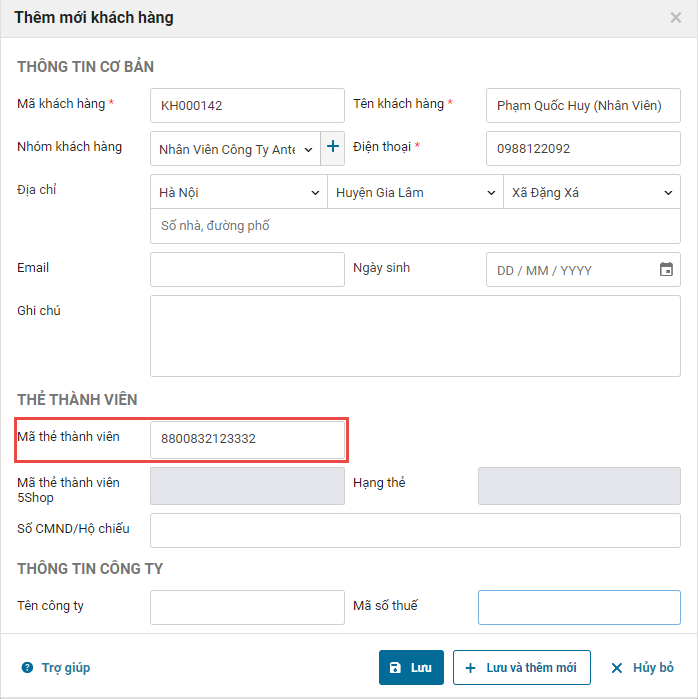 - Trên trang quản lý, Quản lý thêm khách hàng và nhập thông tin mã thẻ thành viên mà cửa hàng quản lý