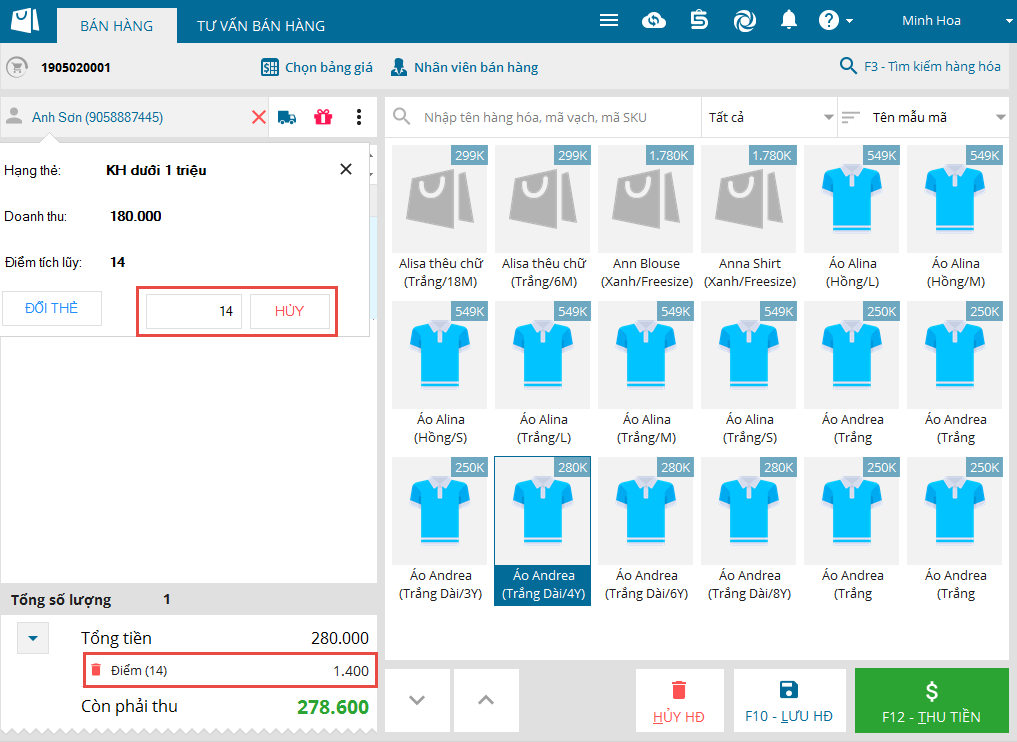 - Trên ứng dụng bán hàng PC, thu ngân thanh toán hóa đơn cho khách hàng có thẻ tích điểm và đổi điểm 5Shop, nhập số điểm để thanh toán hóa đơn thì chương trình tự động giảm trừ số tiền phải thu khách hàng.