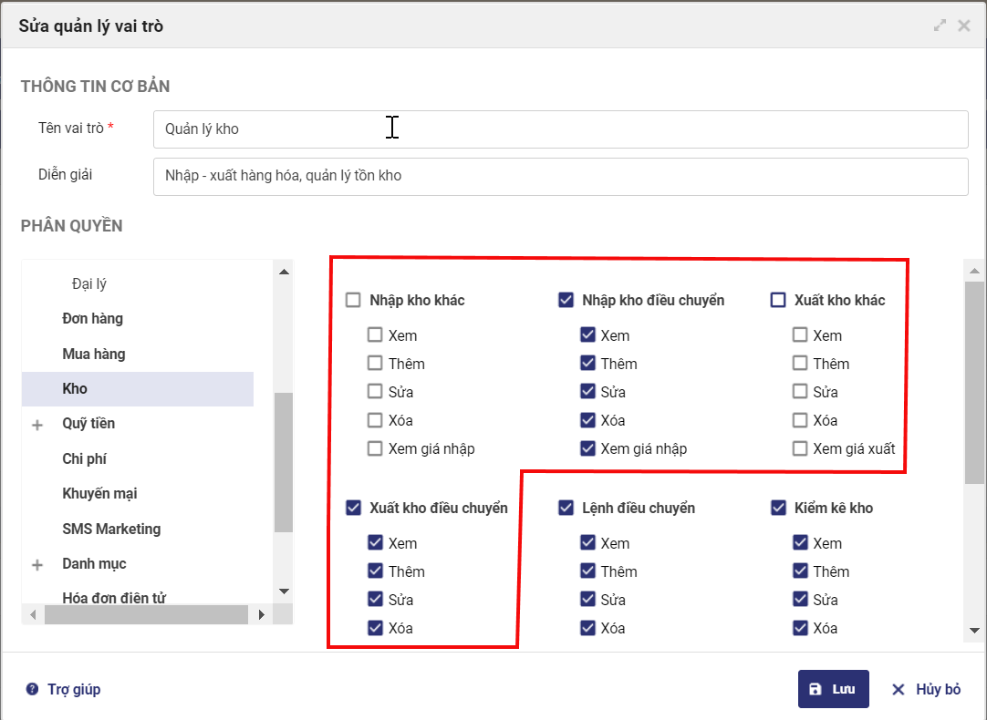 2. Chương trình bổ sung phân quyền chi tiết cho phân hệ kho, báo cáo và SMS Marketing.