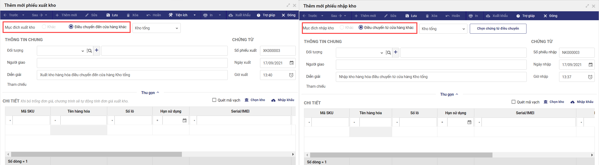 Nhấn Lưu để thêm mới phiếu nhập kho điều chuyển.