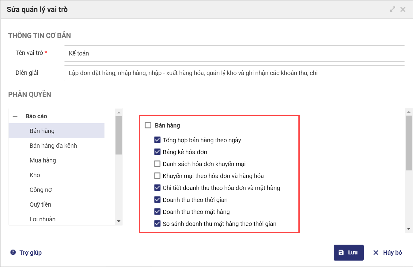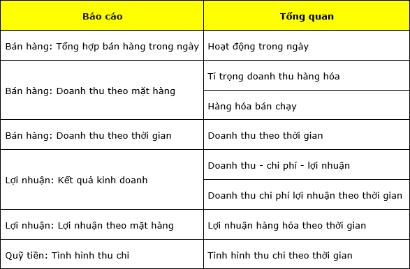 Lưu ý: Phân quyền chi tiết báo cáo bán hàng, công nợ, quỹ tiền thì tự động phân quyền báo cáo tương ứng trên tổng quan. Chi tiết như bảng bên dưới: