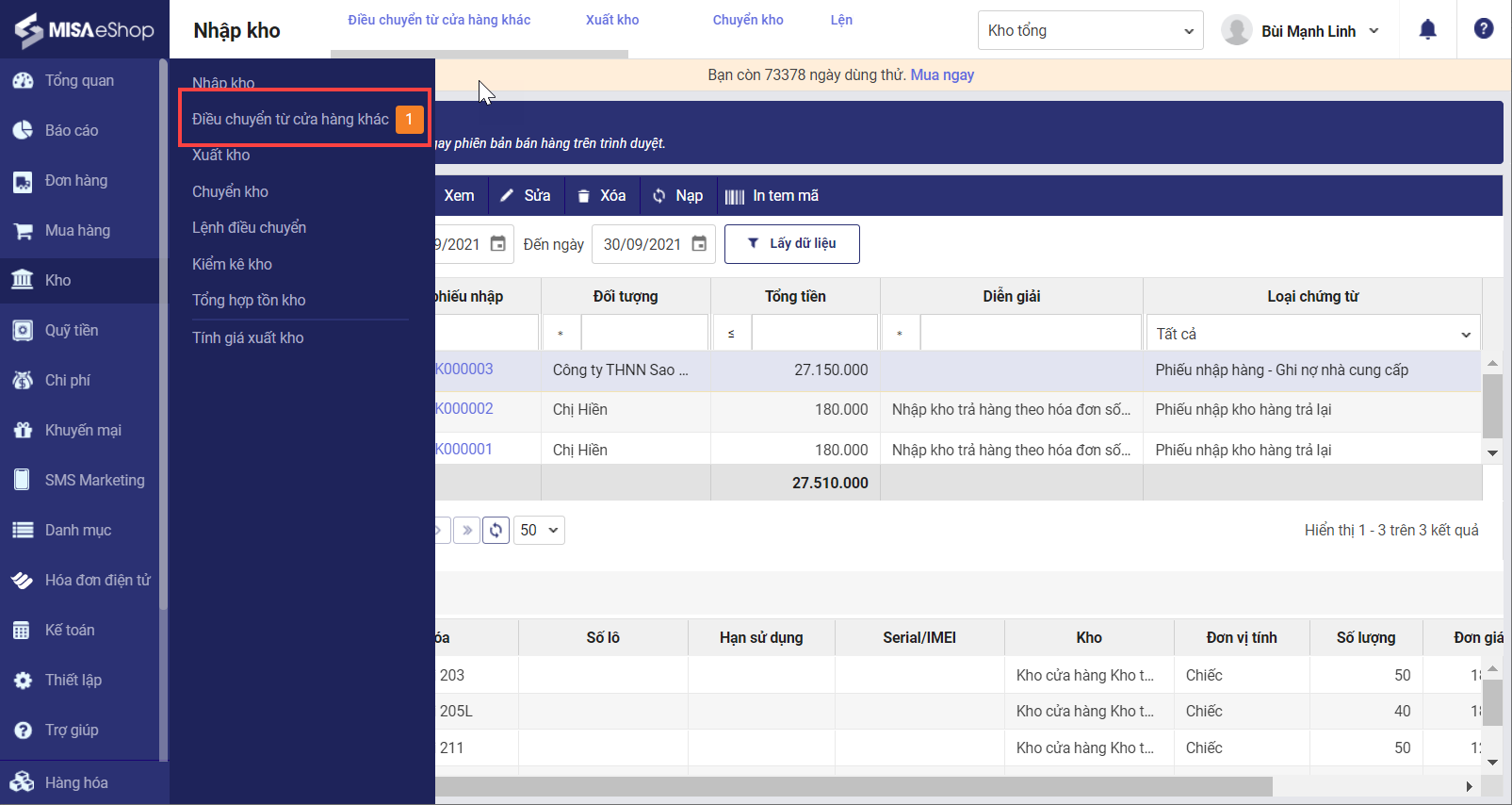 Bước 3: Nhân viên nhấn vào thông báo hoặc vào chức năng Điều chuyển từ cửa hàng khác để thực hiện nhập kho điều chuyển theo phiếu xuất kho điều chuyển