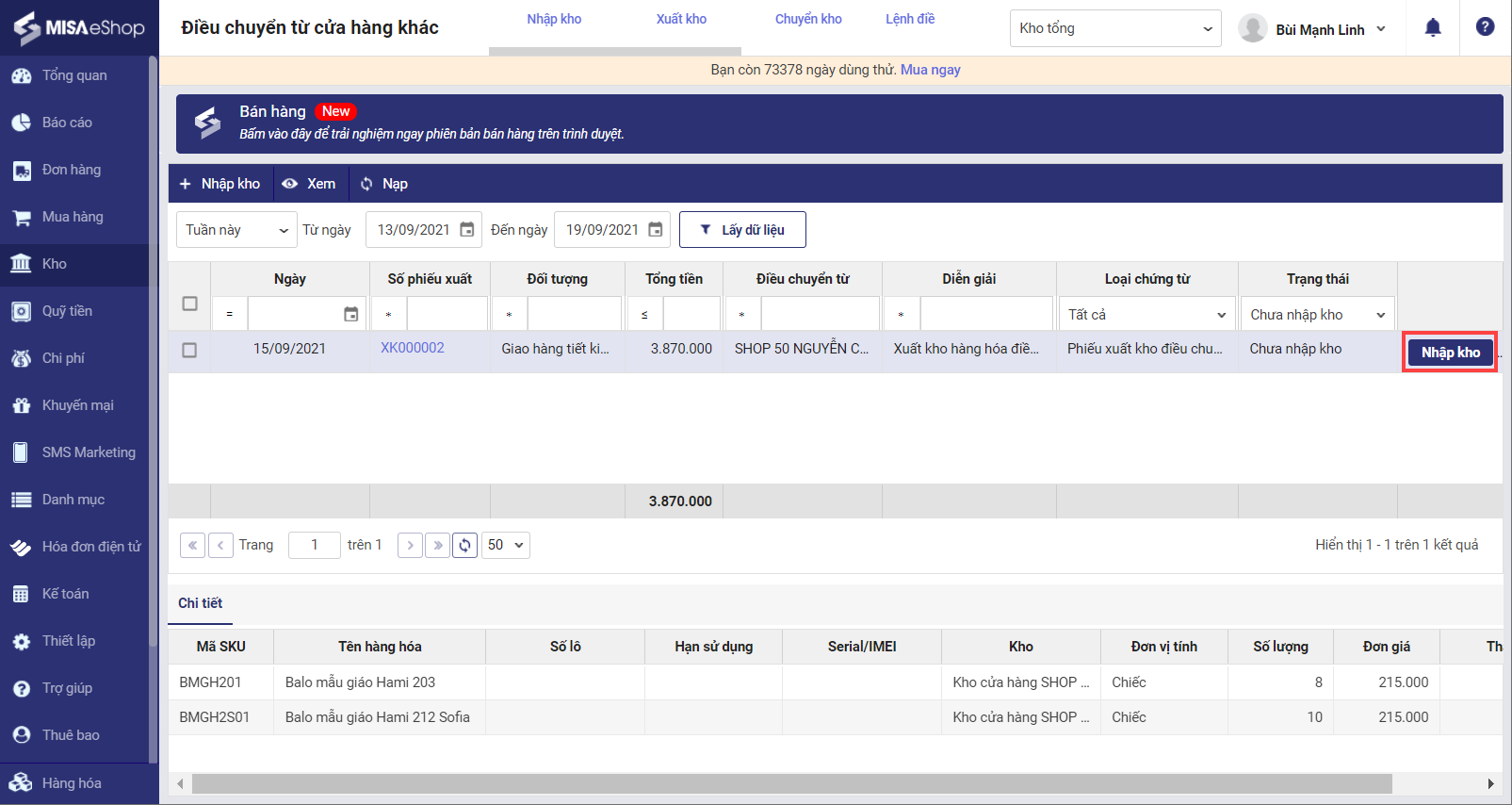 Chọn phiếu xuất kho cần nhập kho điều chuyển, nhấn nút nhập kho