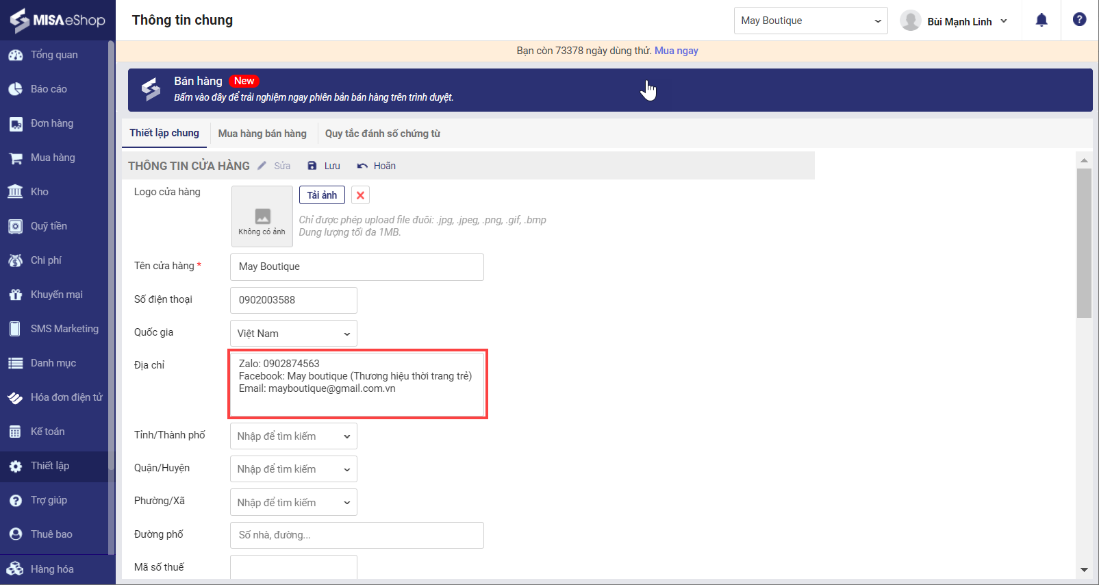 4. Cửa hàng có thể thiết lập thông tin địa chỉ cửa hàng thành nhiều dòng.