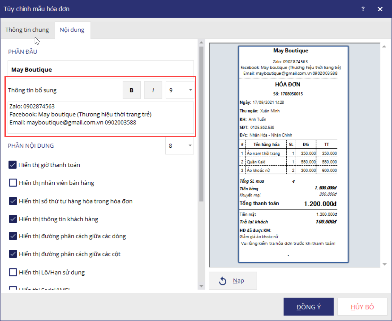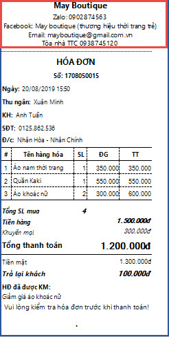 Hóa đơn in ra sẽ hiển thị các thông tin thành nhiều dòng giống như đã thiết lập.