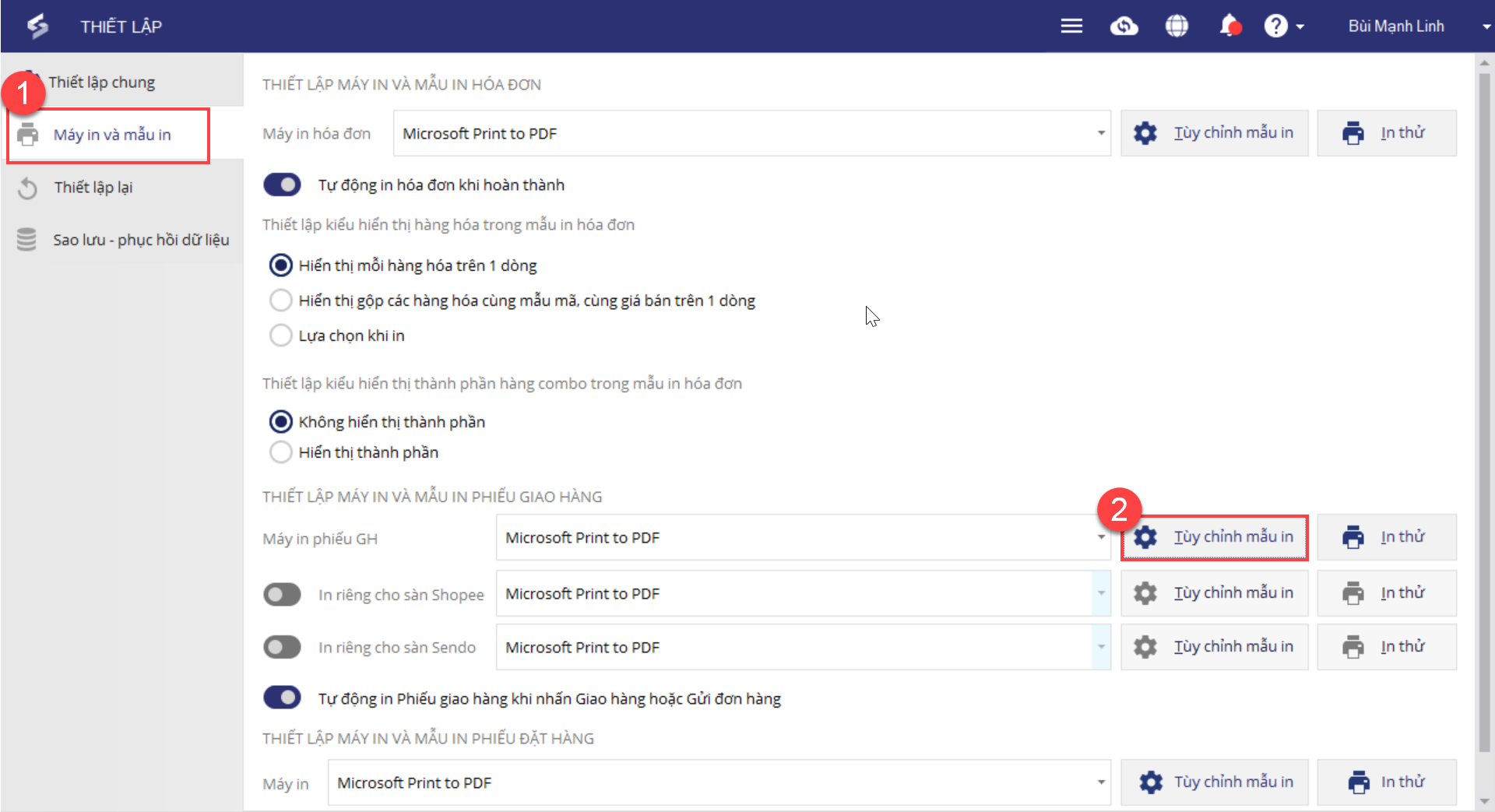 Quản lý cửa hàng truy cập màn hình thiết lập, máy in và mẫu in, nhấn nút tùy chỉnh mẫu in ở phần “Thiết lập máy in và mẫu in phiếu giao hàng”