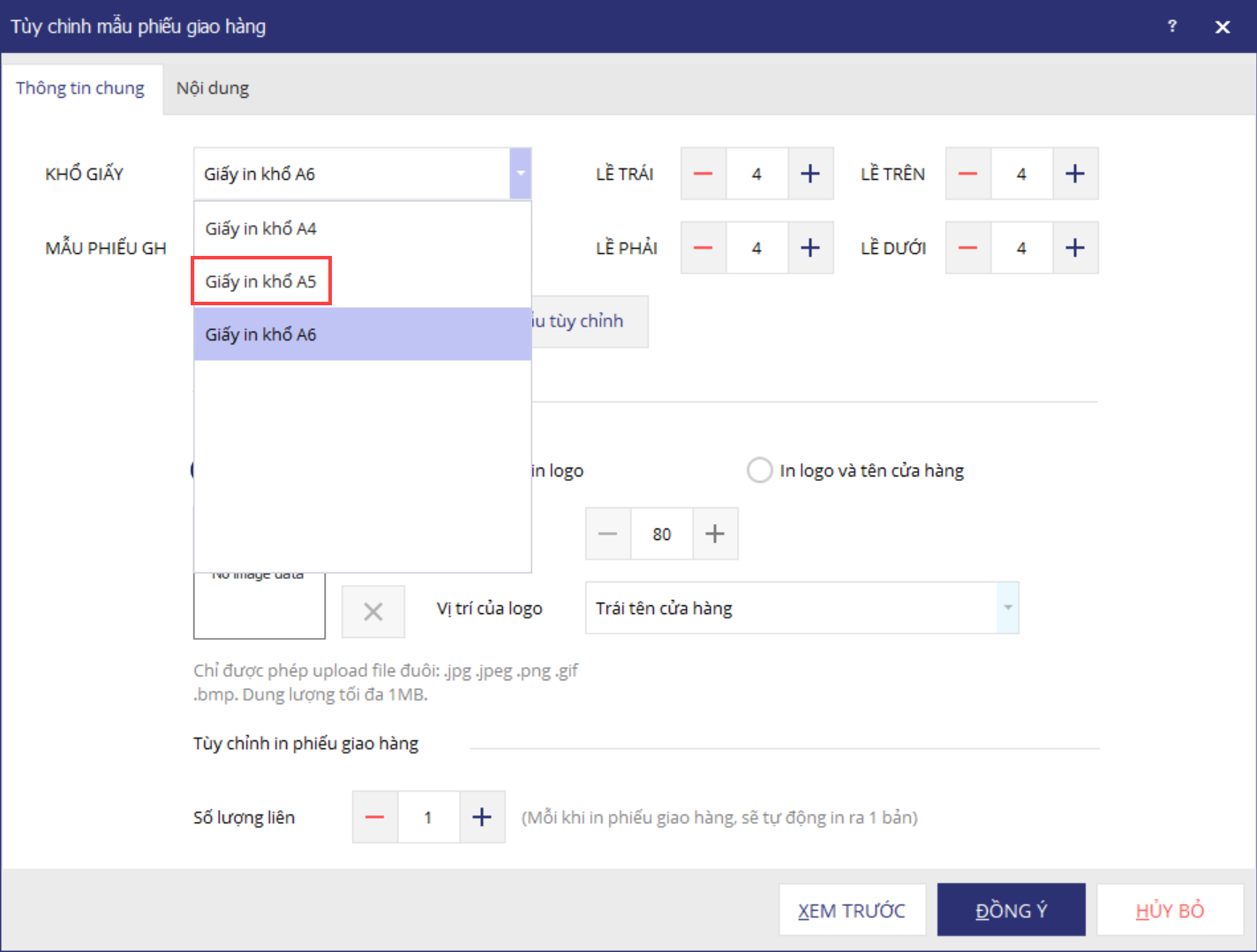 Bước 2: Chọn khổ giấy cho phiếu giao hàng. Quản lý cửa hàng có thể chọn khổ giấy A4 hoặc A5 tùy nhu cầu của cửa hàng