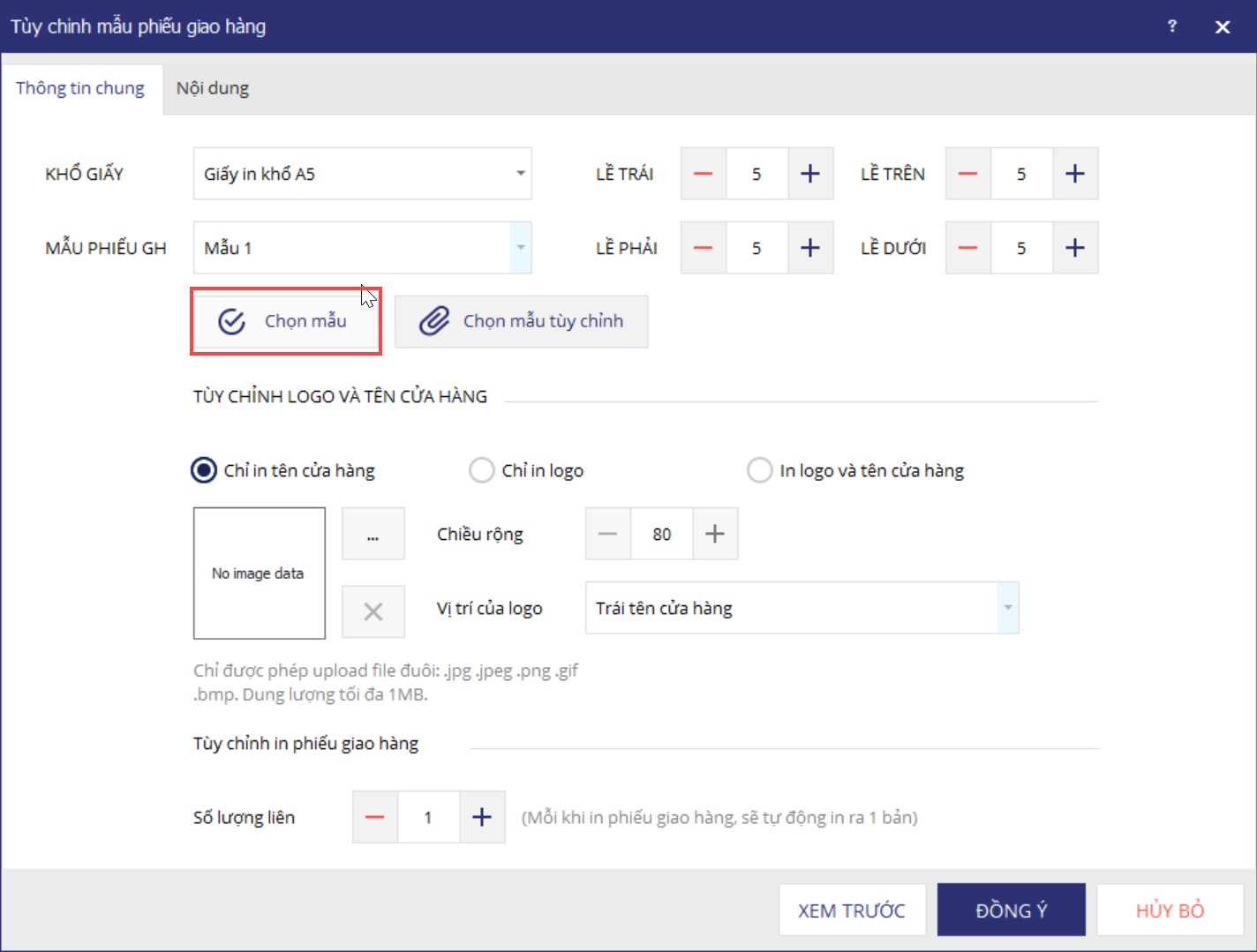 • Khổ giấy A5 có 2 mẫu in có thể hiển thị ảnh hàng hóa là mẫu 2 và mẫu 3