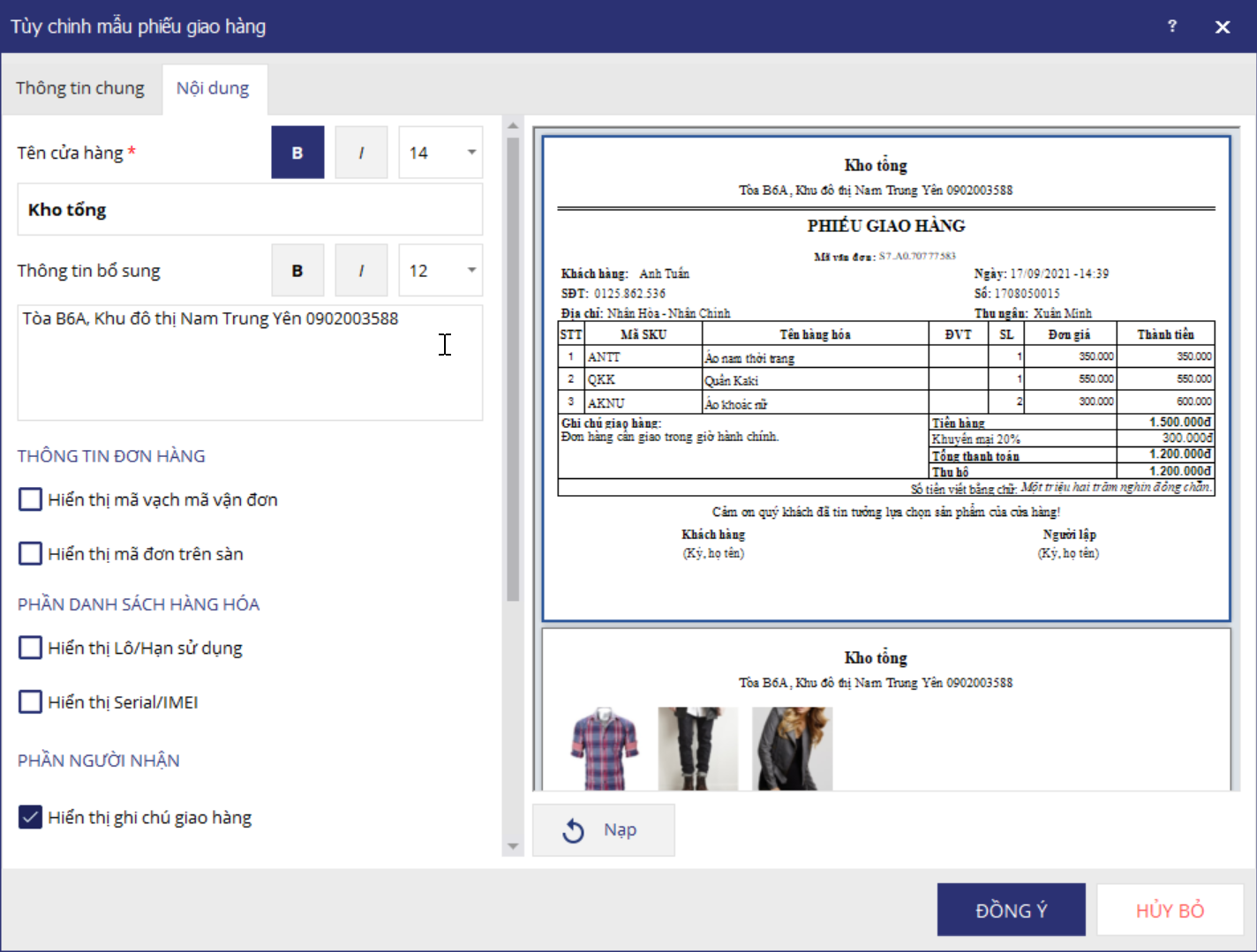 Lưu ý: Quản lý cửa hàng có thể xem trước hiển thị của phiếu giao hàng bên phần nội dung