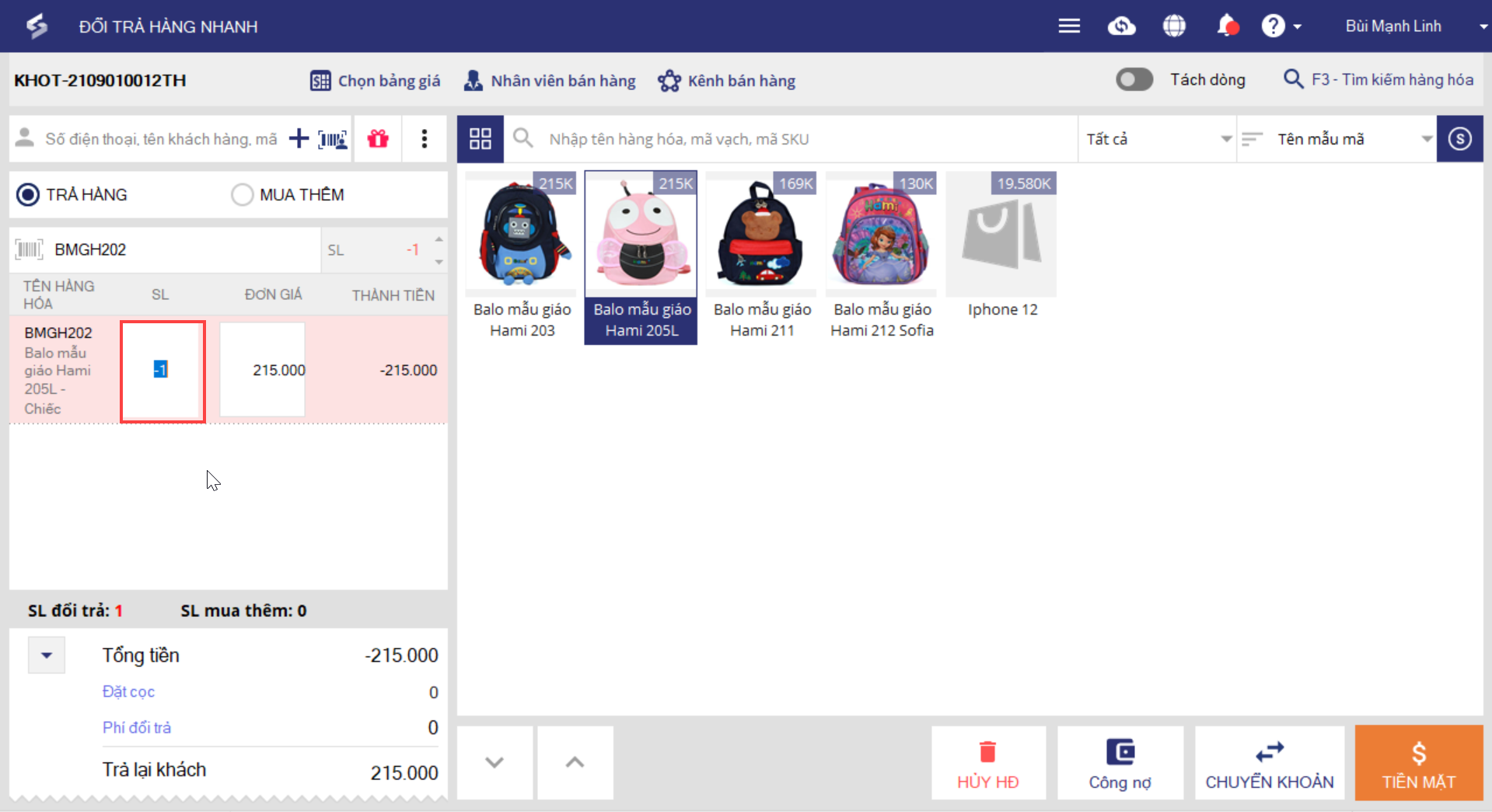Tại màn hình lập hóa đơn đổi trả hàng nhanh, thu ngân có thể nhập trực tiếp số lượng hàng hóa trả lại hoặc mua thêm.