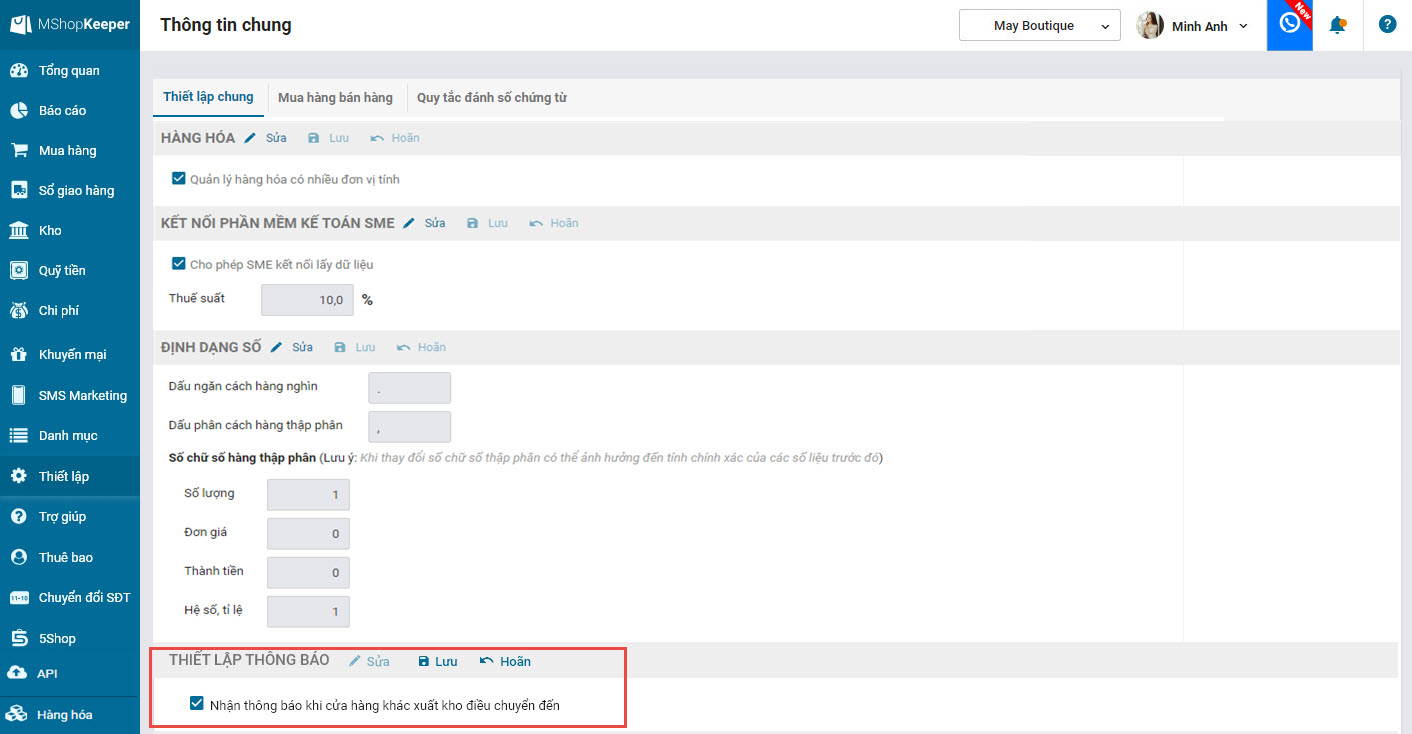 Quản lý cửa hàng đăng nhập trang quản lý, vào chức năng Thiết lập để thiết lập “Nhận thông báo khi cửa hàng khác xuất kho điều chuyển đến”