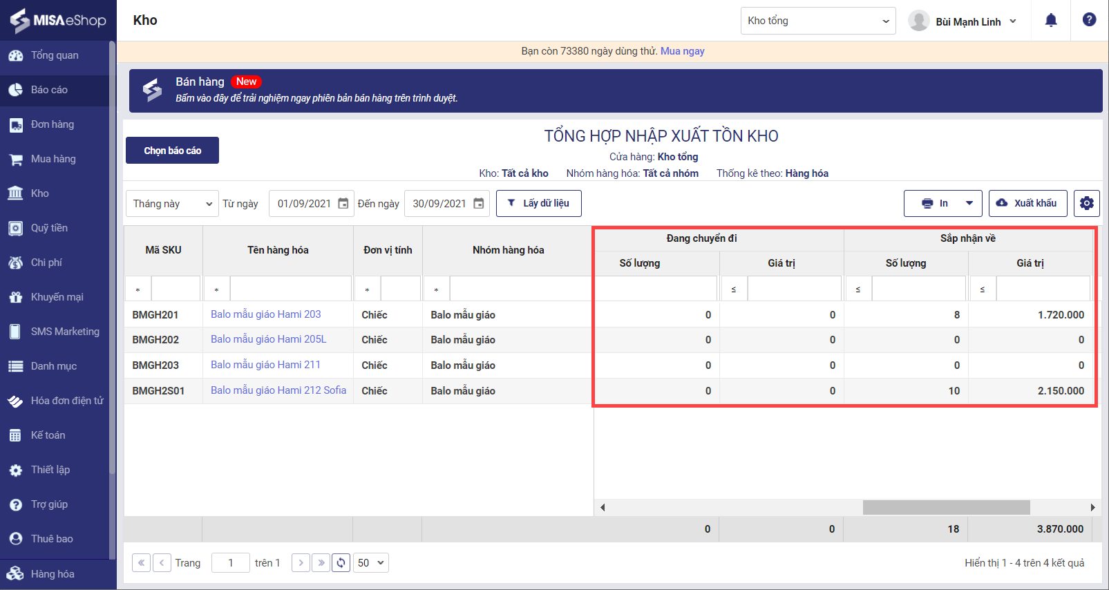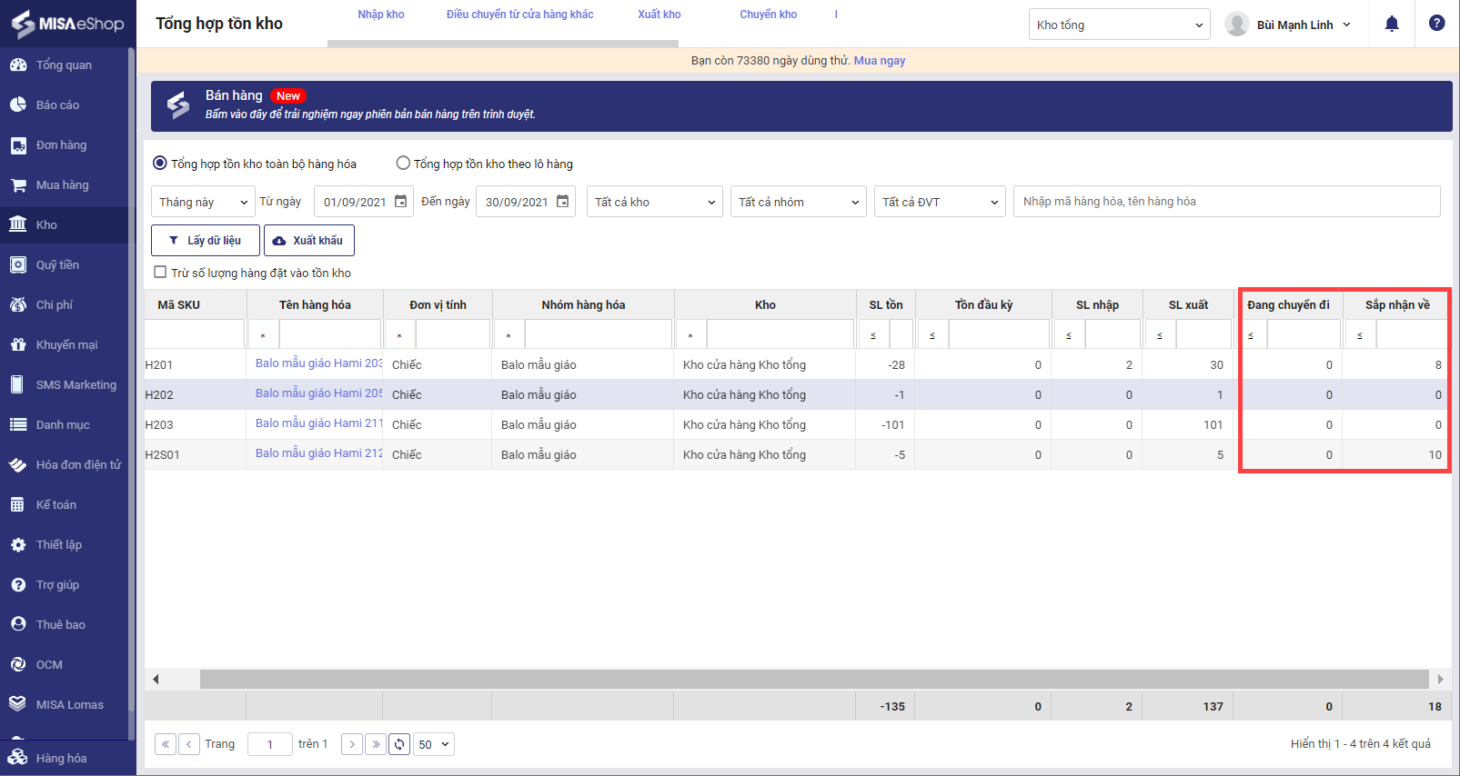 Xem số lượng và giá trị hàng đang chuyển đi/sắp nhận về của từng chi nhánh tại danh mục kho Tổng hợp tồn kho.