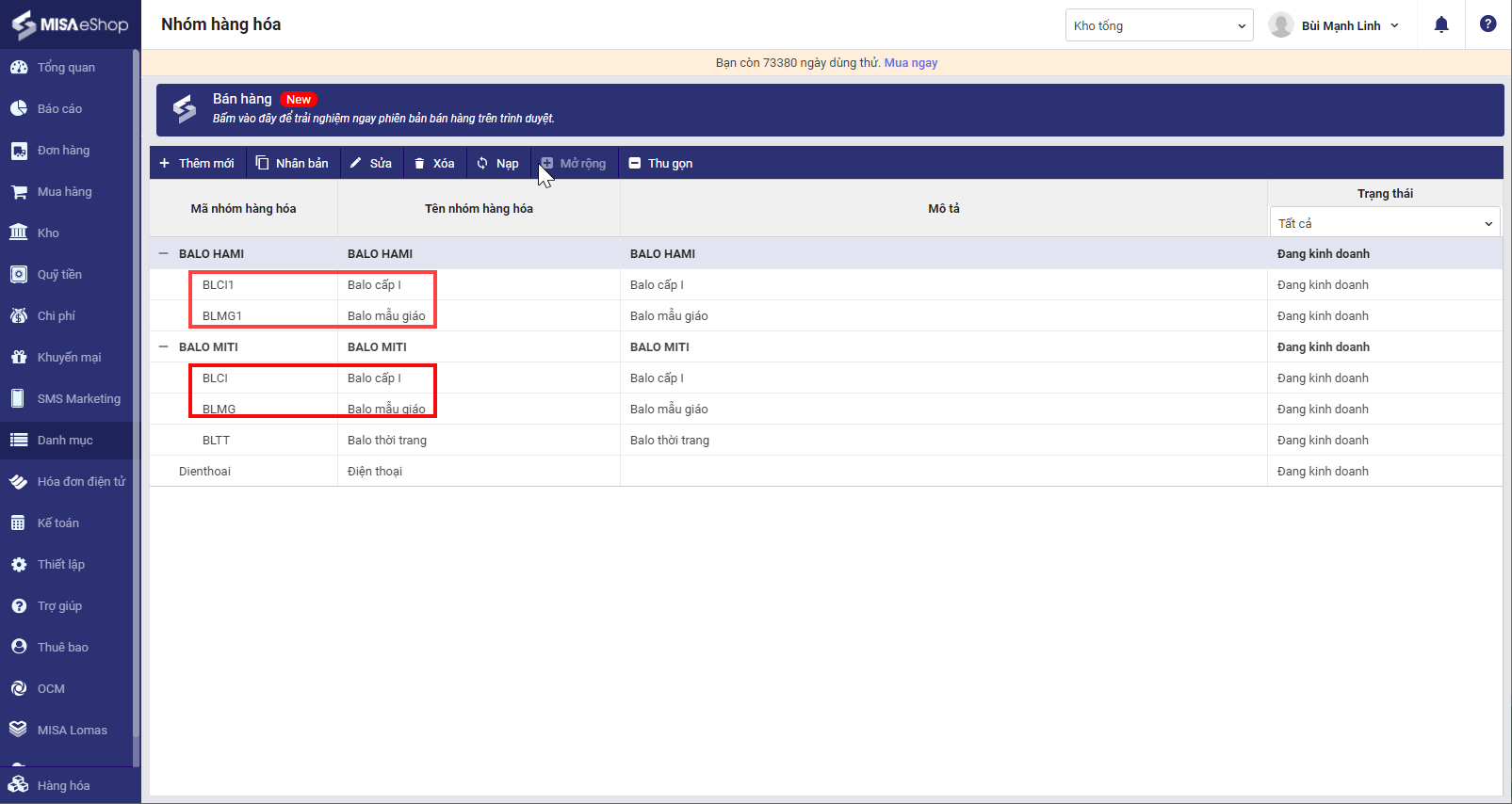 • Tại màn hình danh sách của các danh mục, danh sách các chương trình khuyến mại, voucher, quản lý cửa hàng chọn danh mục muốn nhân bản sau đó nhấn tổ hợp phím Ctrl+C để thực hiện nhân bản danh mục.