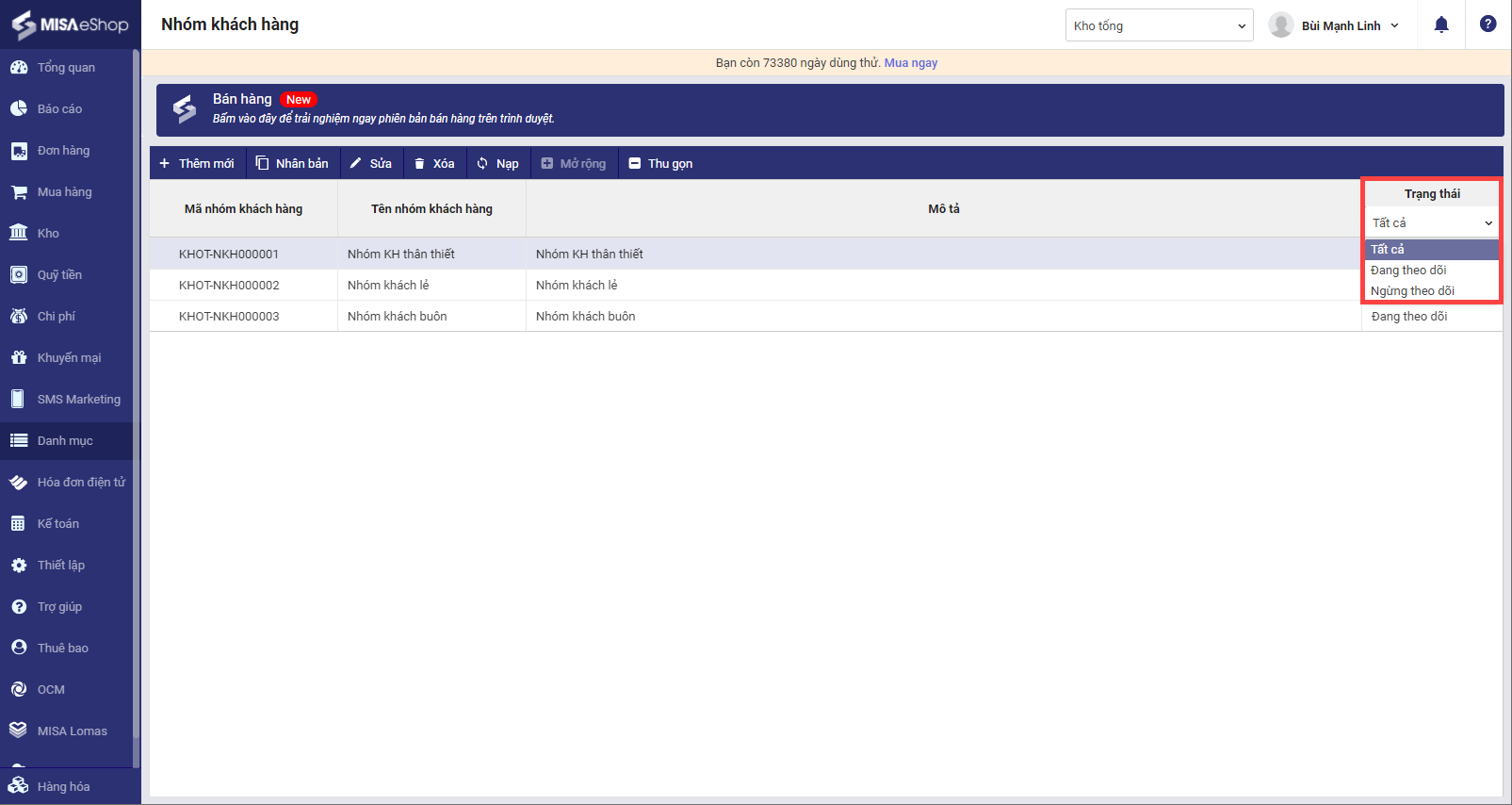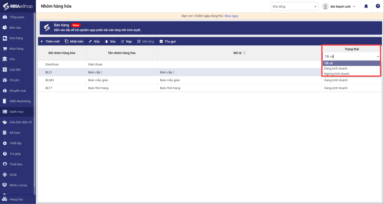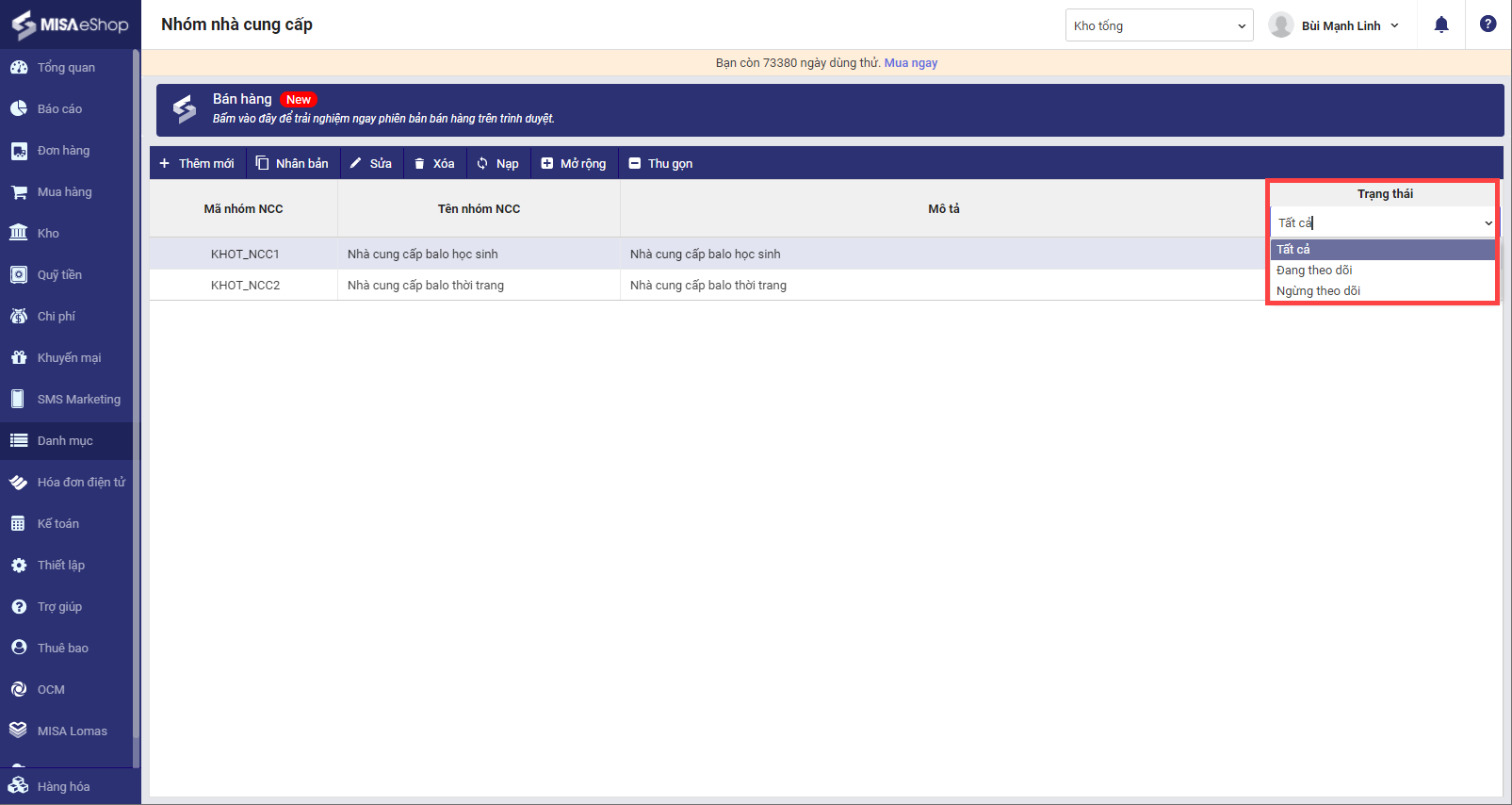 2. Chương trình cho phép quản lý cửa hàng lọc nhóm hàng hóa, nhóm khách hàng, nhóm nhà cung cấp theo trạng thái.