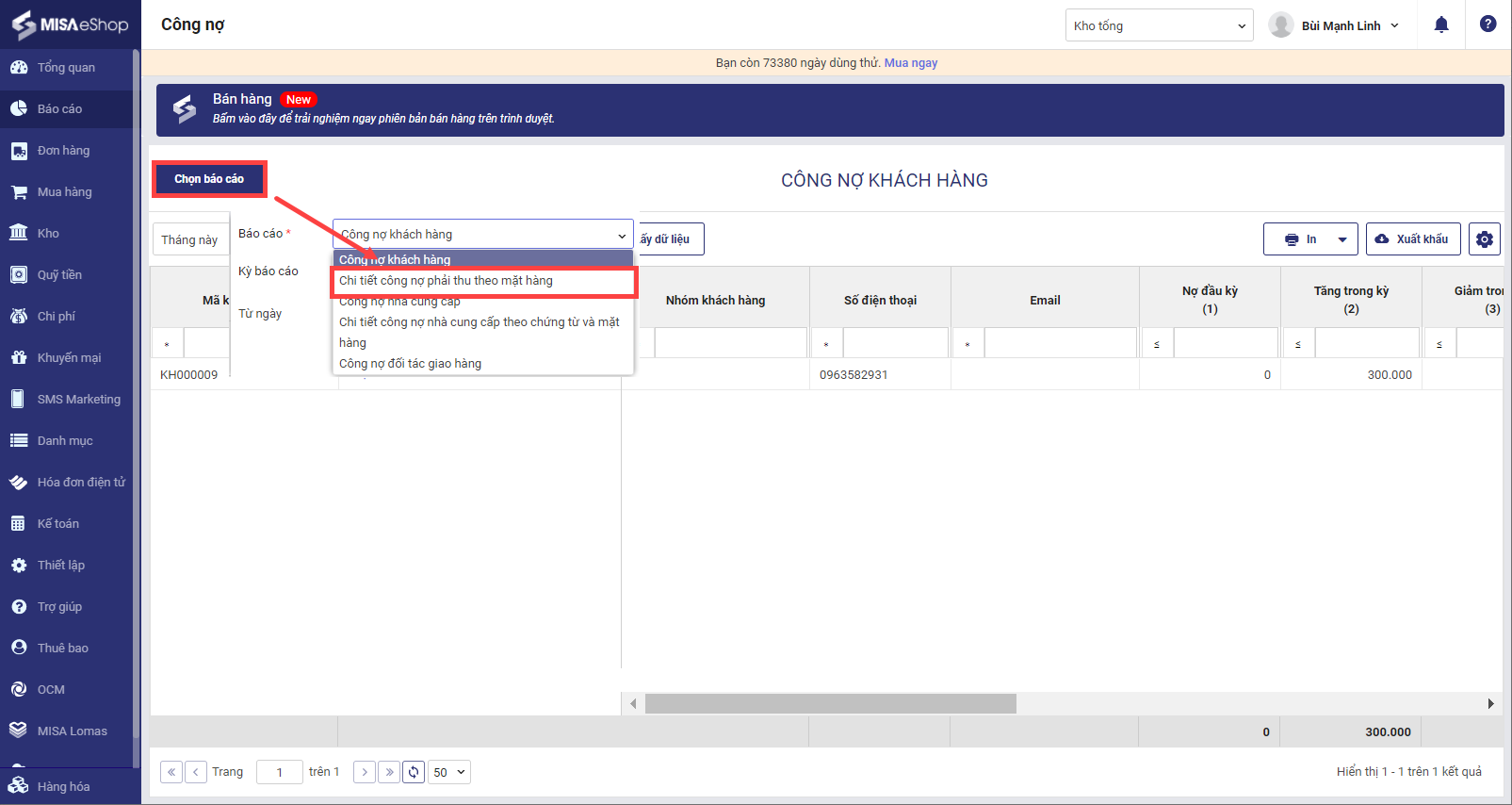 Kế toán truy cập vào màn hình báo cáo công nợ, chọn báo cáo chi tiết công nợ phải thu theo mặt hàng