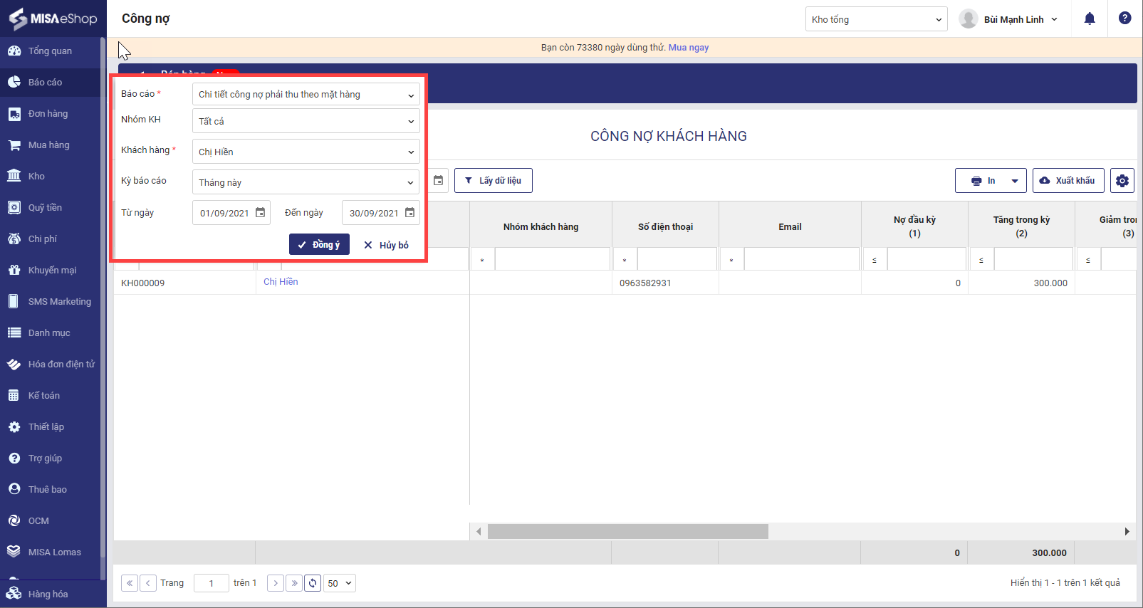 Bước 2: Thực hiện lọc báo cáo theo khách hàng và kỳ báo cáo cần lấy dữ liệu