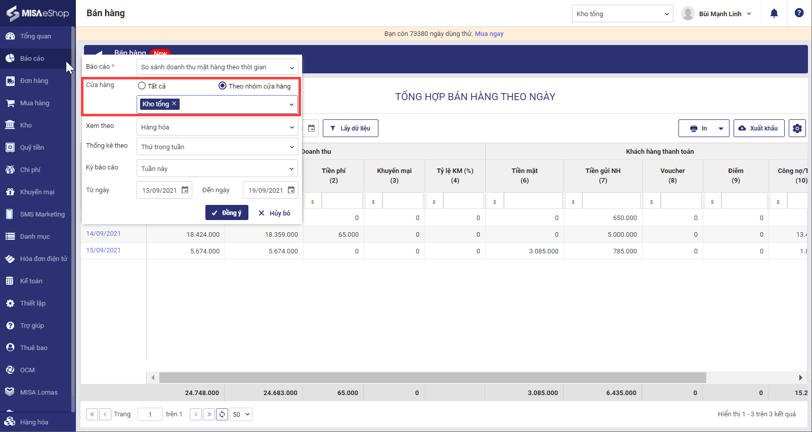 QLCH chọn báo cáo, chọn tham số cửa hàng xem theo Tất cả hoặc Theo nhóm cửa hàng (mặc định hiển thị cửa hàng QLCH đang đứng), cho phép chọn nhiều cửa hàng trong nhóm để xem.