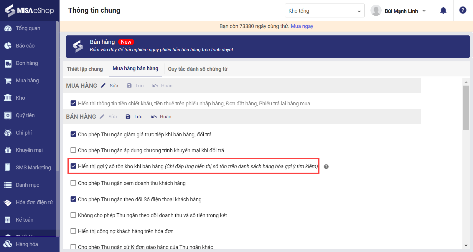 Quản lý cửa hàng thực hiện thiết lập “Hiển thị gợi ý tồn kho khi bán hàng” trên màn hình thiết lập, mua hàng/bán hàng