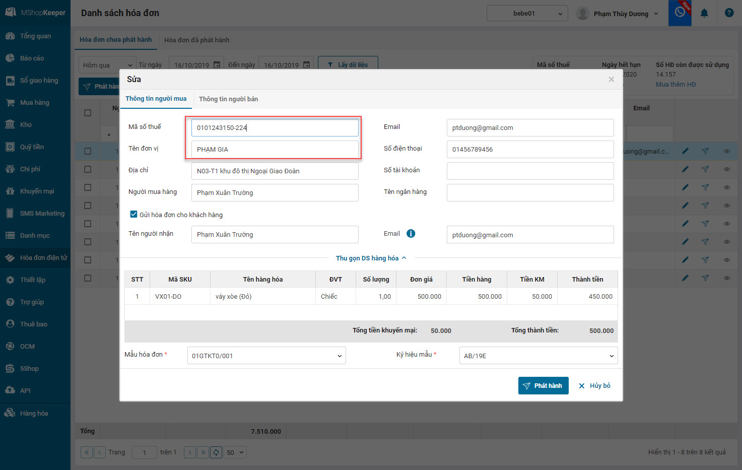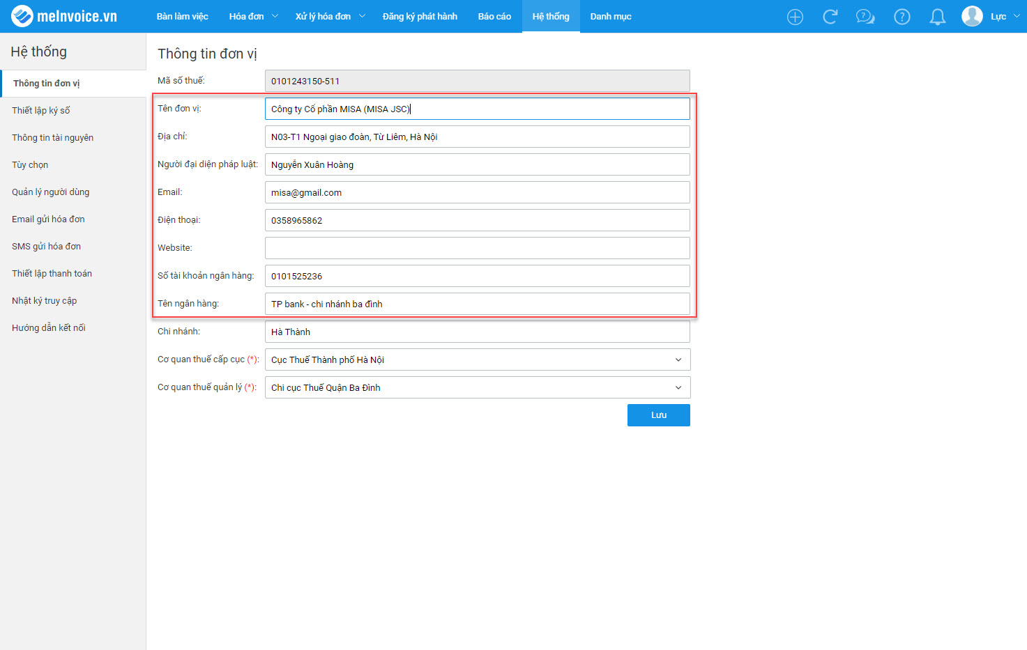 1. Lưu thông tin xuất hóa đơn điện tử của khách hàng