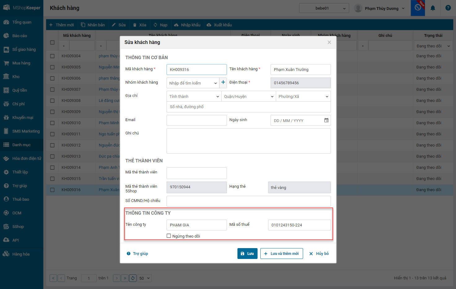 – Thông tin đơn vị được cập nhật vào thông tin khách hàng