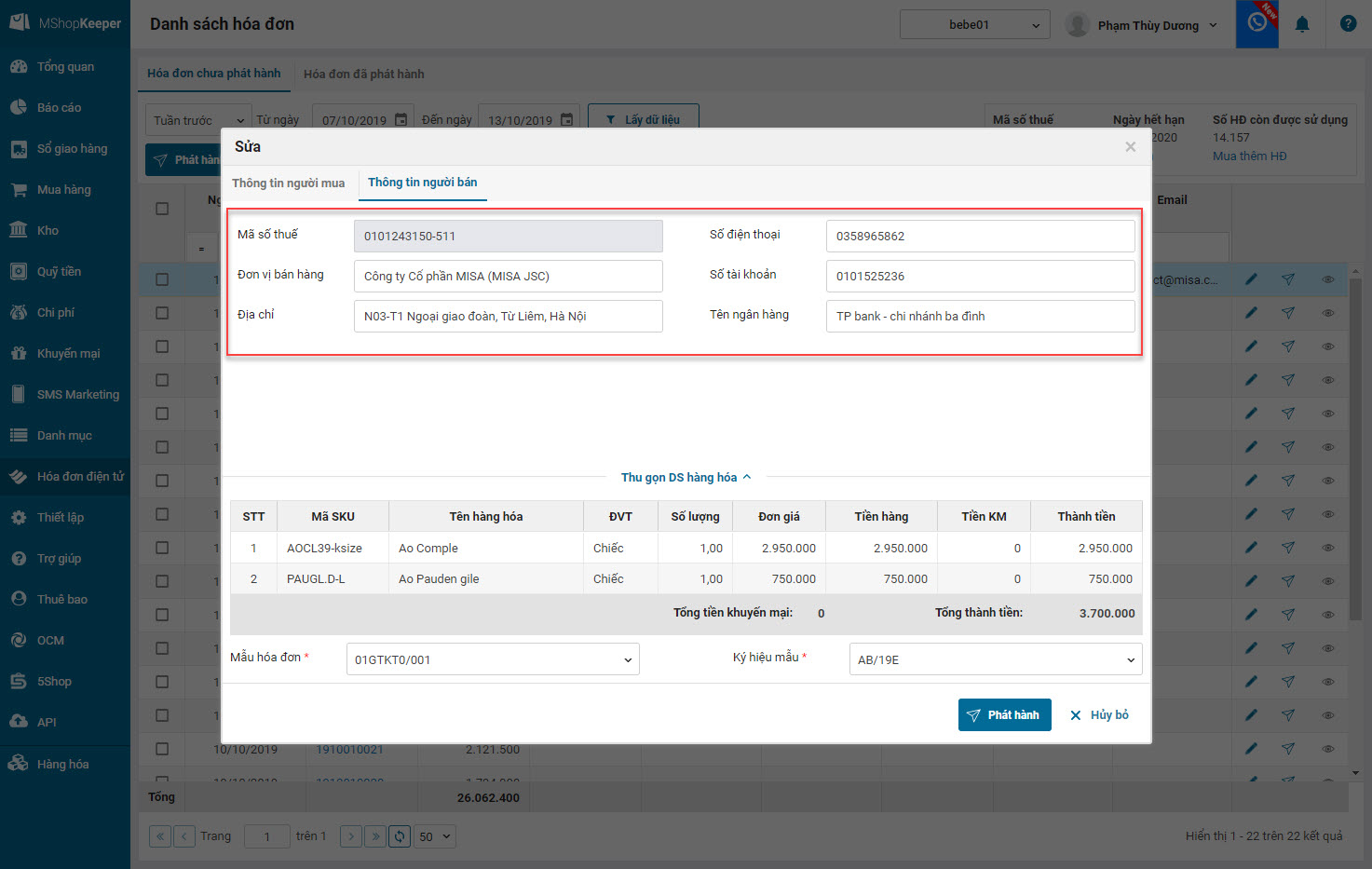8. Cải tiến lưu lại thông tin xuất hóa đơn điện tử của khách hàng để có thông tin xuất hóa đơn cho lần sau mà không cần phải hỏi lại khách và cập nhật lại thông tin xuất hóa đơn của cửa hàng khi thay đổi thông tin trên meInvoice.