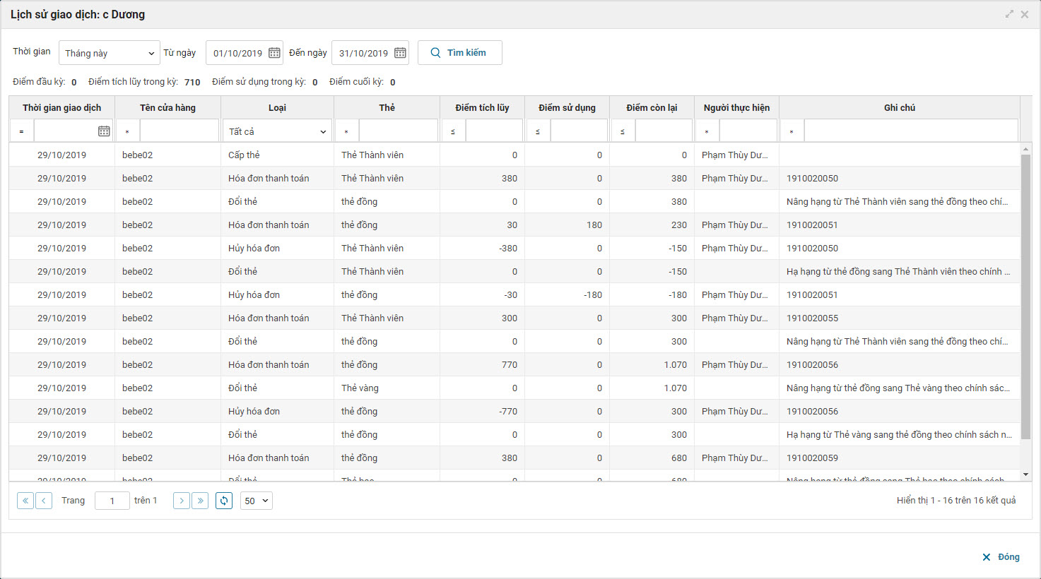 Bước 4: Quản lý cửa hàng xem lịch sử giao dịch ghi nhận cho từng thành viên trên danh sách thành viên cửa hàng quản lý.