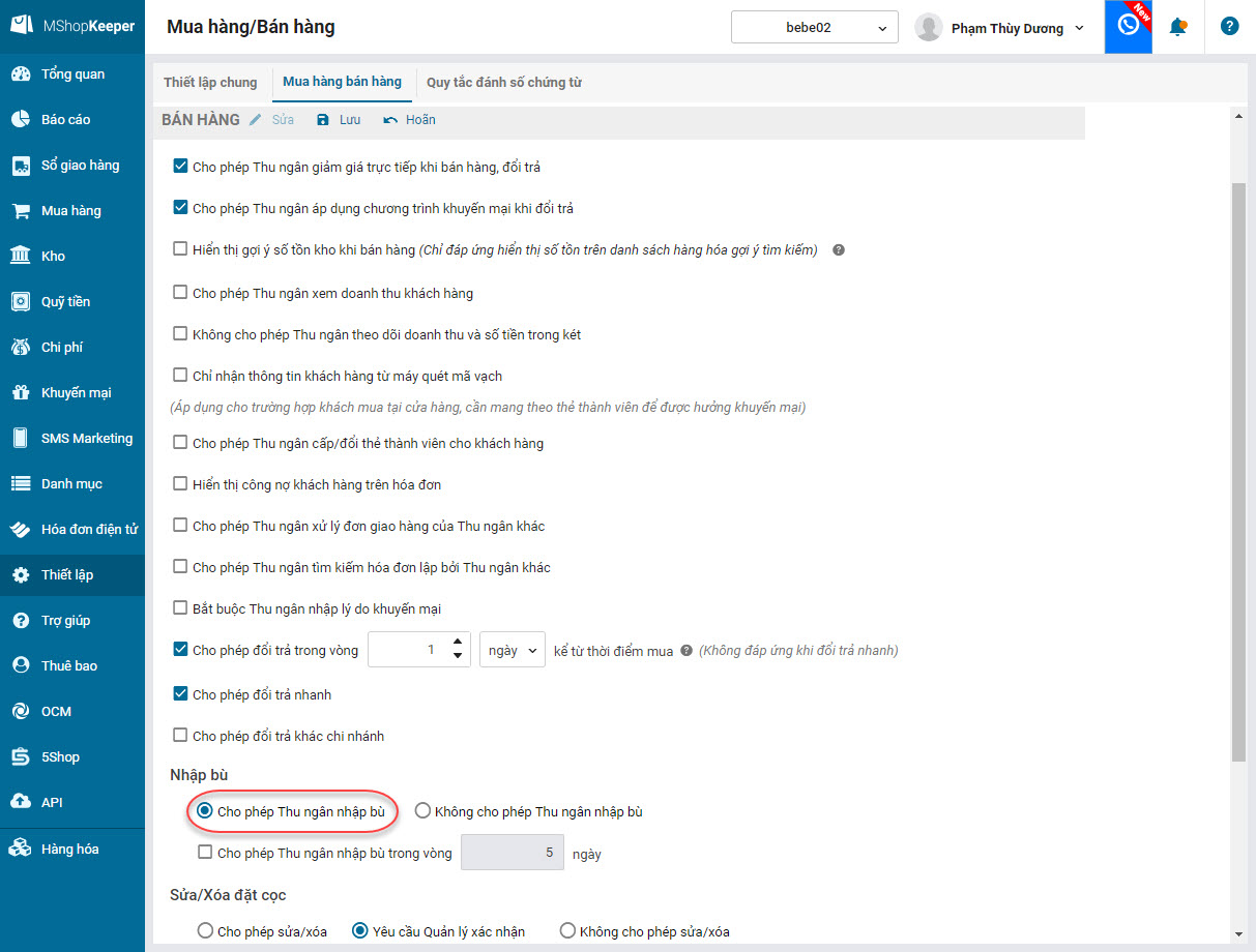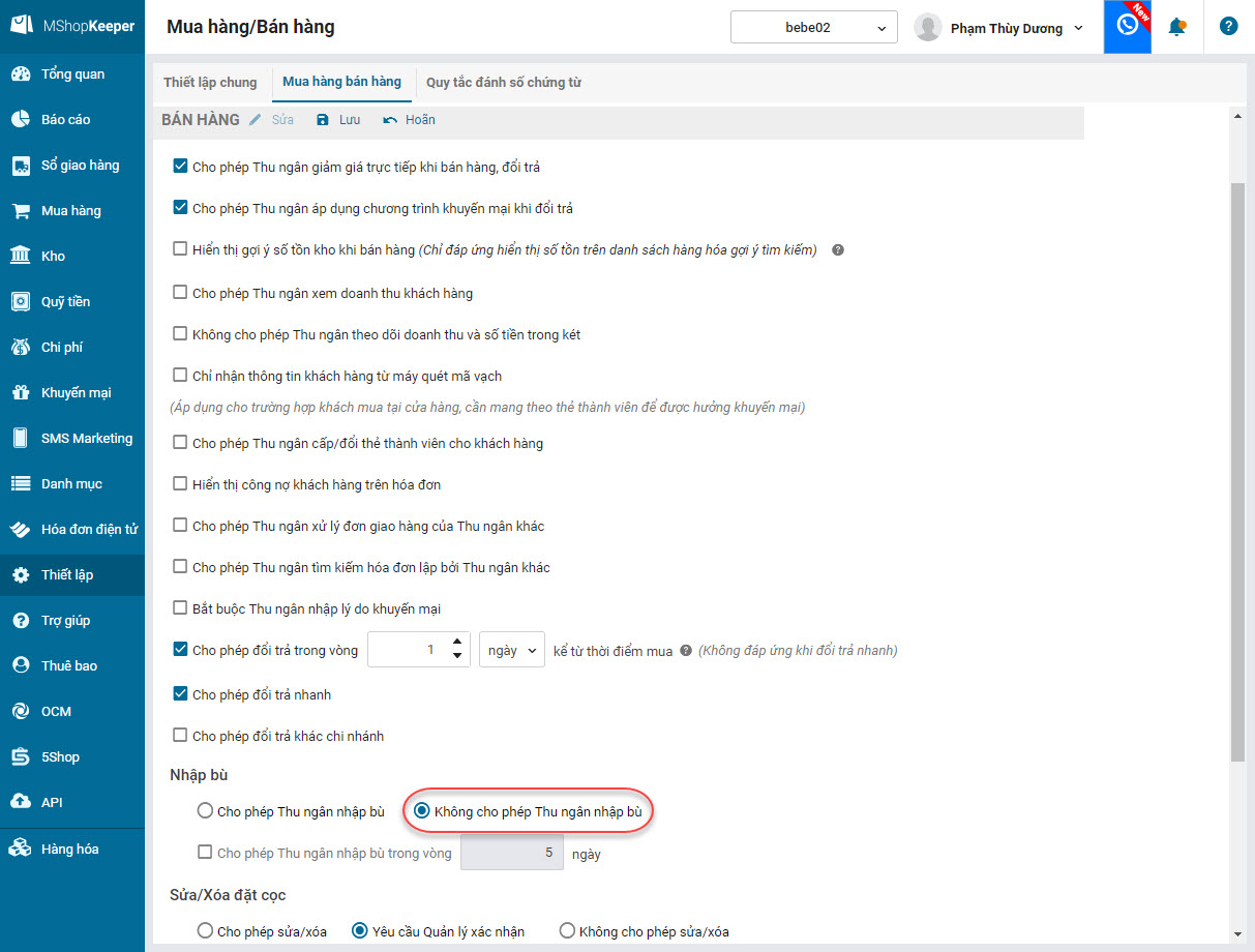 - Cho phép Thu ngân nhập bù: Khi quản lý chọn thiết lập này thì Thu ngân vẫn được nhập bù bình thường, không giới hạn số ngày.