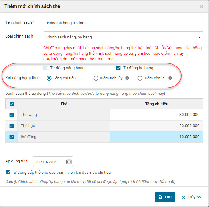 Bước 2: Quản lý cửa hàng chọn điều kiện nâng hạ hạng thẻ theo mong muốn (mặc định chương trình tự động nâng hạng). Nhấn Lưu để tạo chính sách.