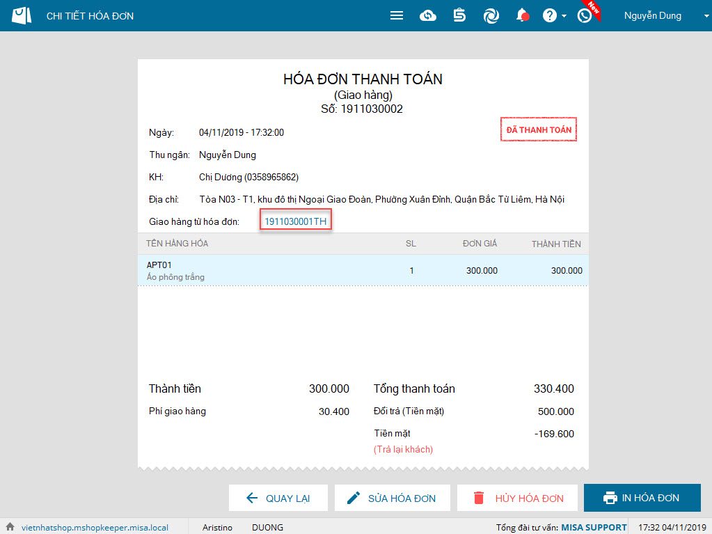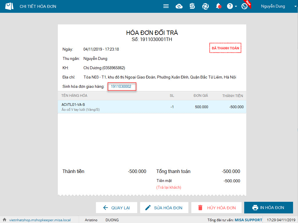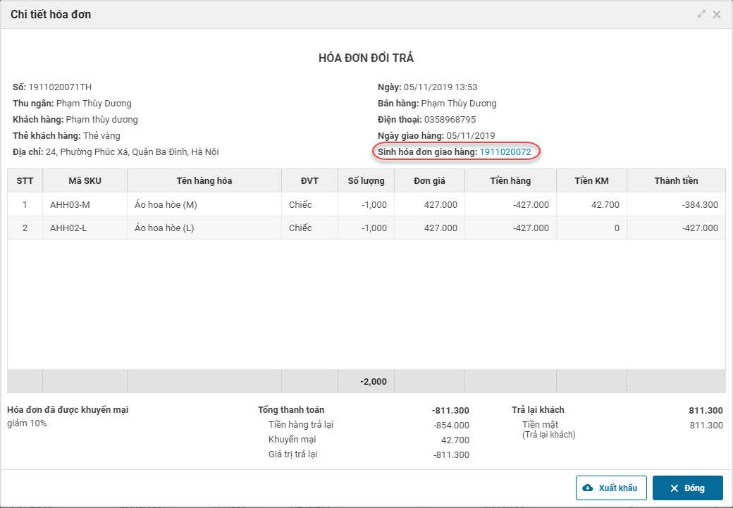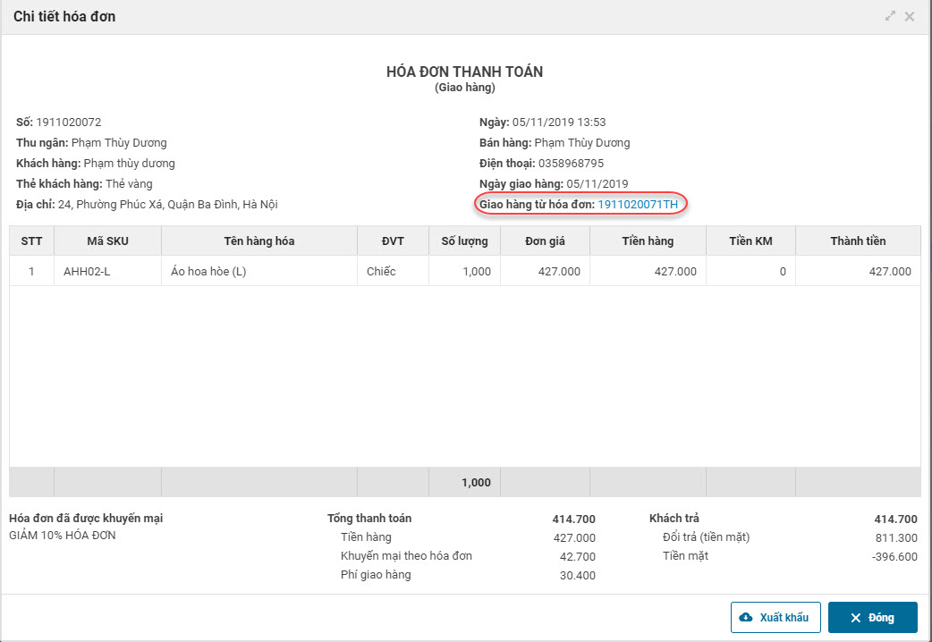 Bước 4: Thu ngân kiểm tra đơn hàng đổi trả giao hàng bằng cách vào màn hình chi tiết hóa đơn, tích chọn đến hóa đơn giao hàng từ hóa đơn đổi trả.