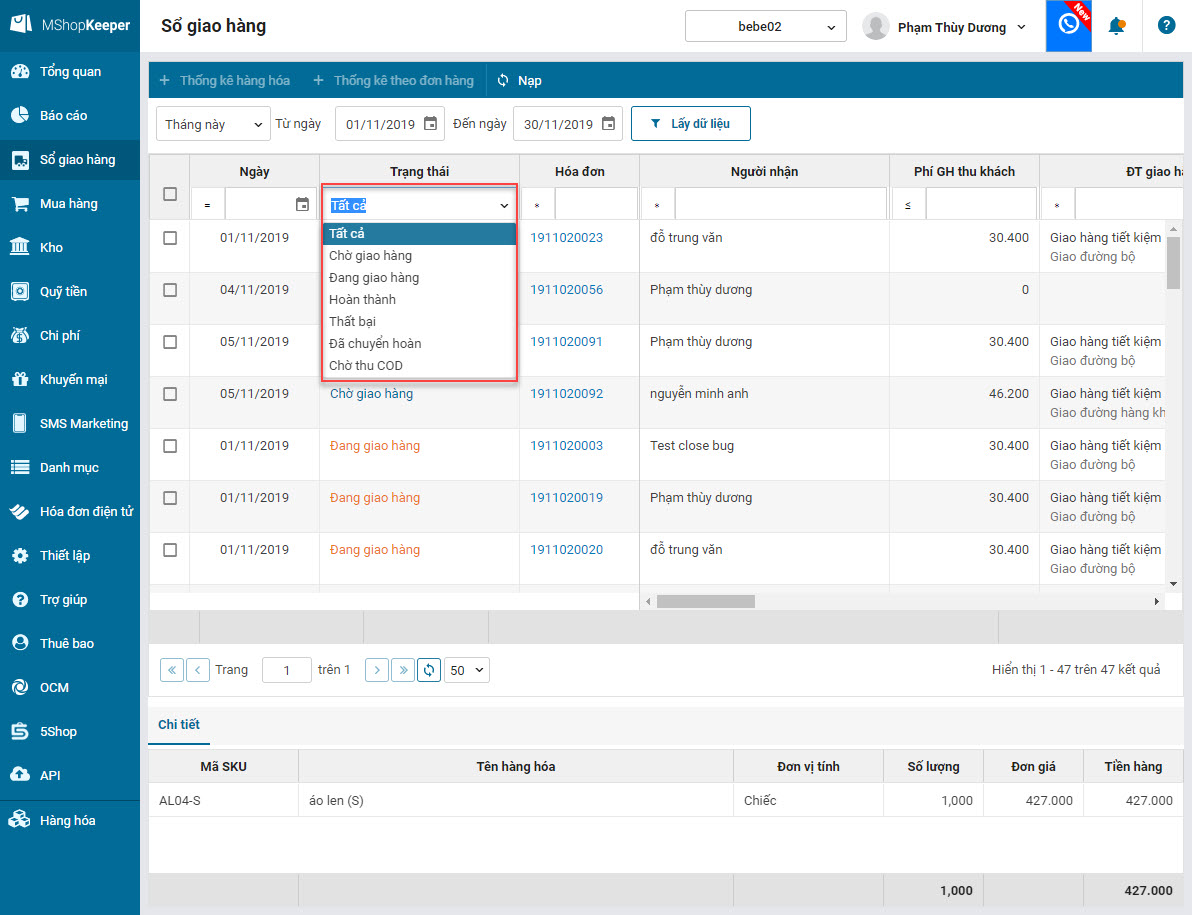 Bước 1: Trên màn hình sổ giao hàng, QLCH lọc những đơn hàng cần thống kê theo trạng thái hoặc ngày hóa đơn