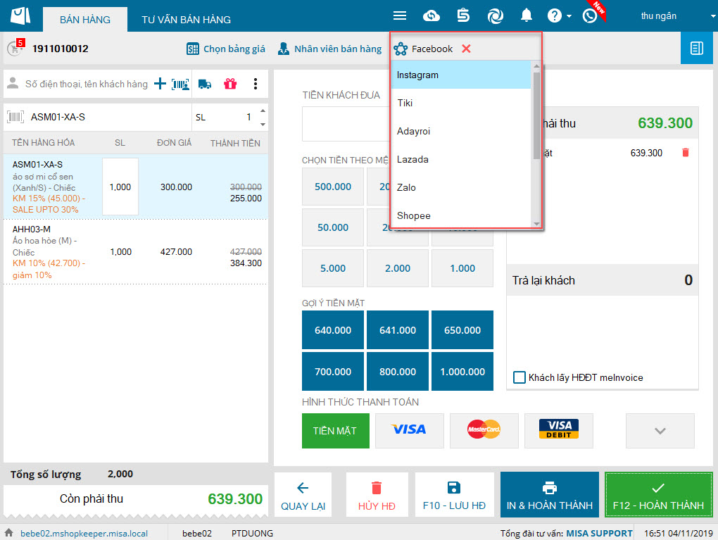 4. Thu ngân muốn chọn được kênh bán hàng cho Hóa đơn tại cửa hàng