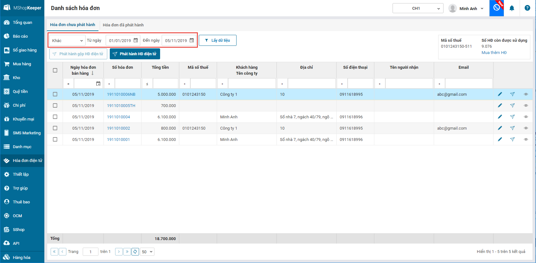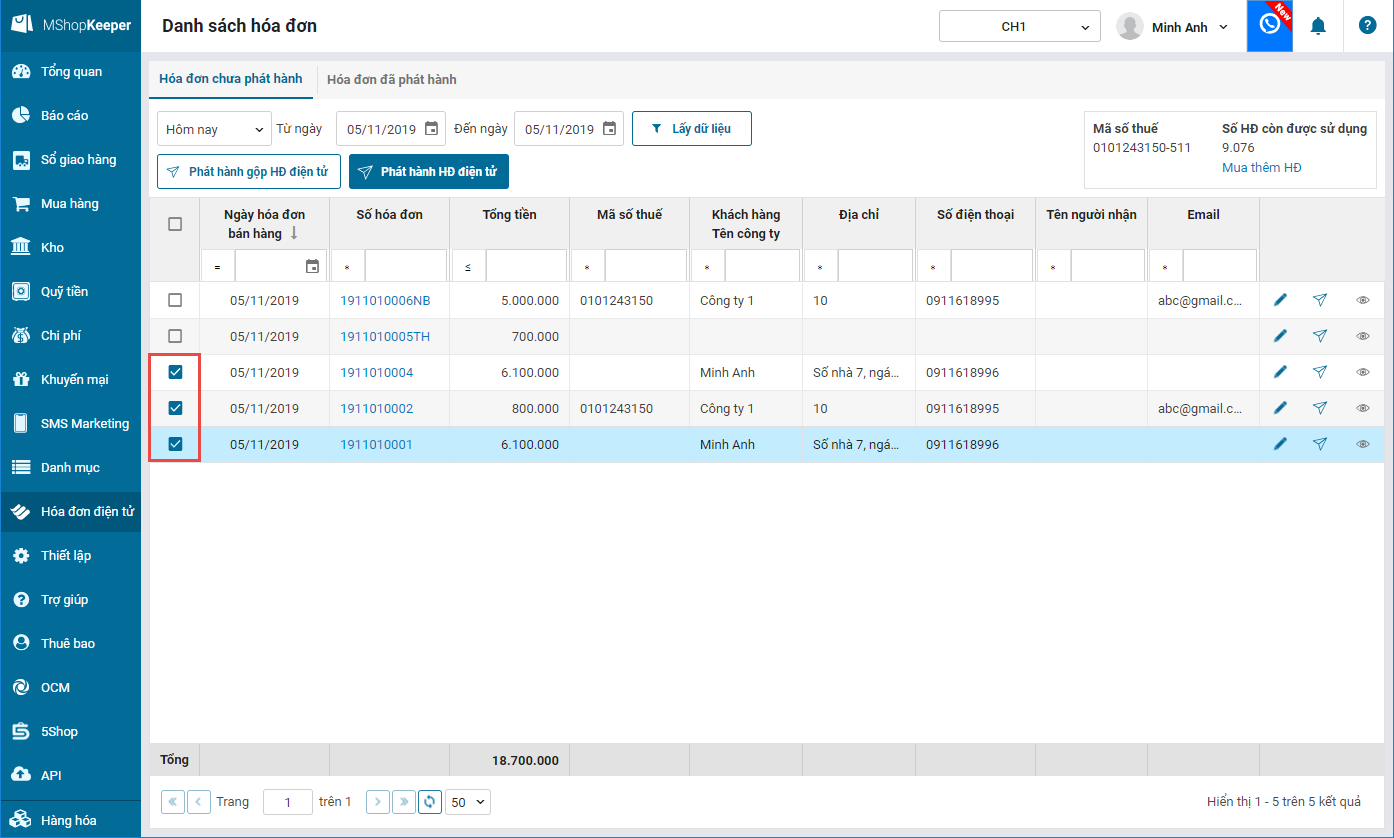 4. Quản lý cửa hàng có thể phát hành gộp nhiều hóa đơn bán hàng thành một hóa đơn điện tử và theo dõi danh sách hóa đơn theo khoảng thời gian tùy chọn.