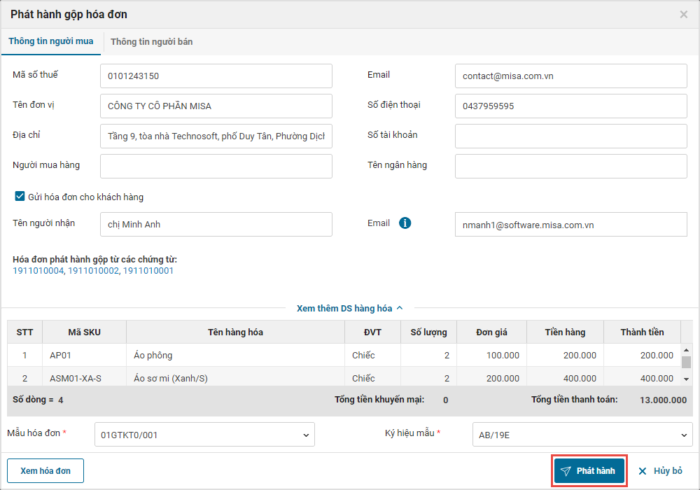 Bước 2: Tích chọn các hóa đơn muốn phát hành gộp.